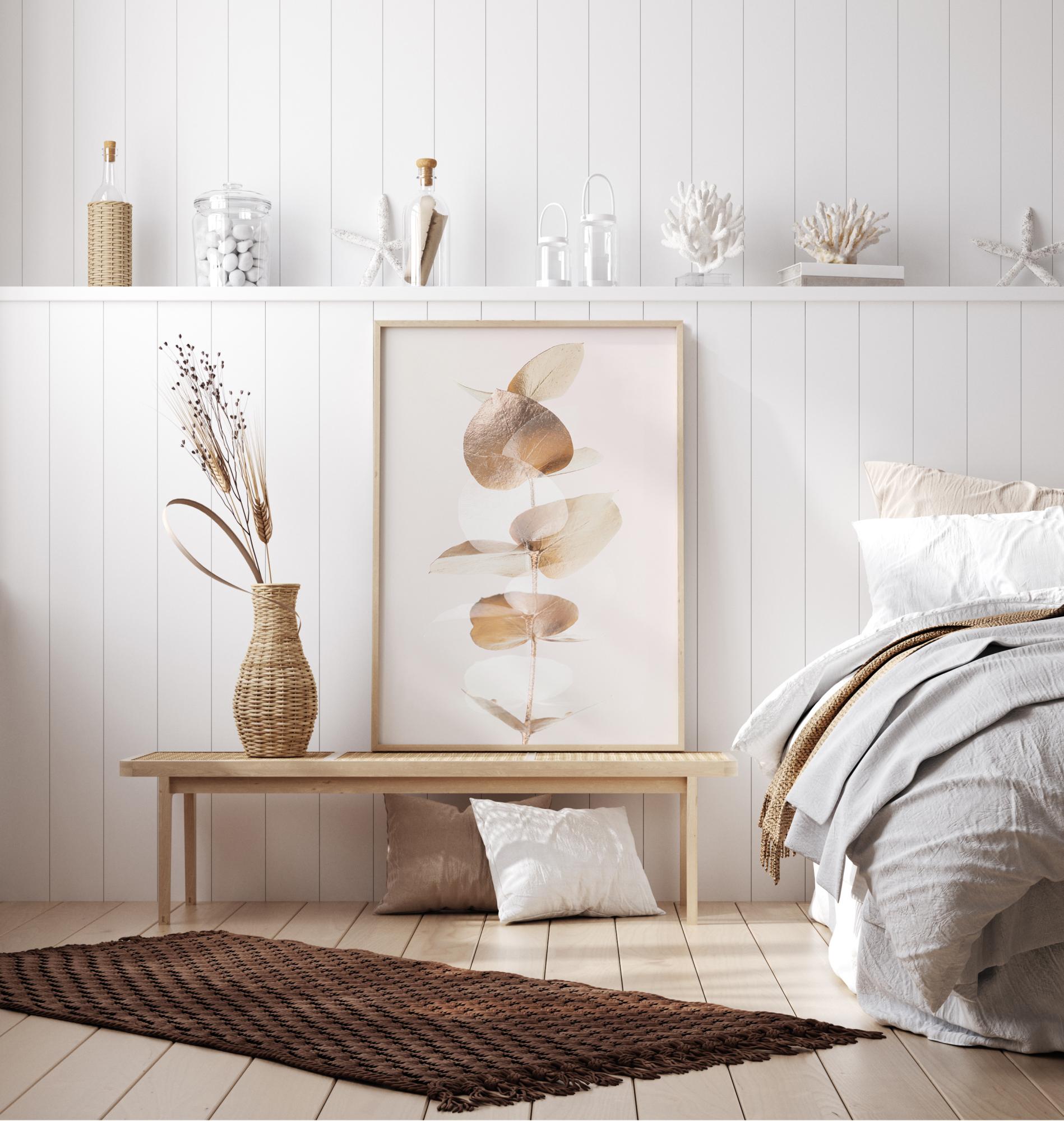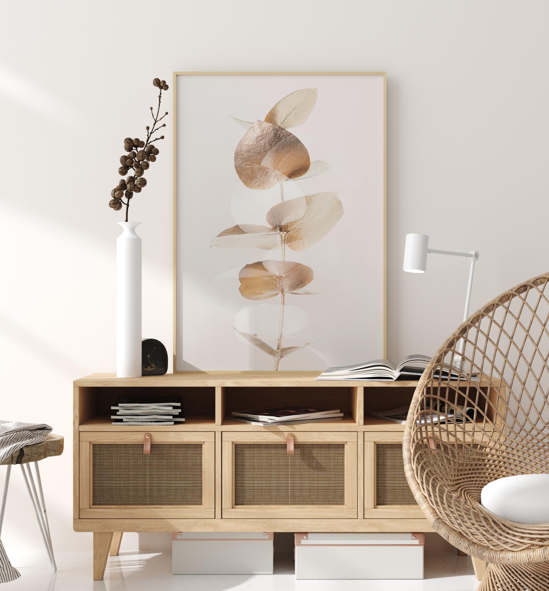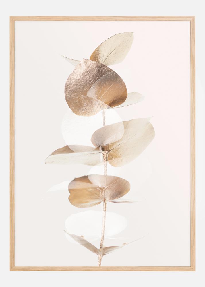Plakat izbliza s nekoliko zlatnih listova eukaliptusa. Jednostavna elegancija ove slike pojačana je jednostavnom bijelom pozadinom. Zlatni listovi nježno svjetlucaju dok ispunjavaju plakat svojom blagom svjetlošću koja stvara osjećaj mira u kući.