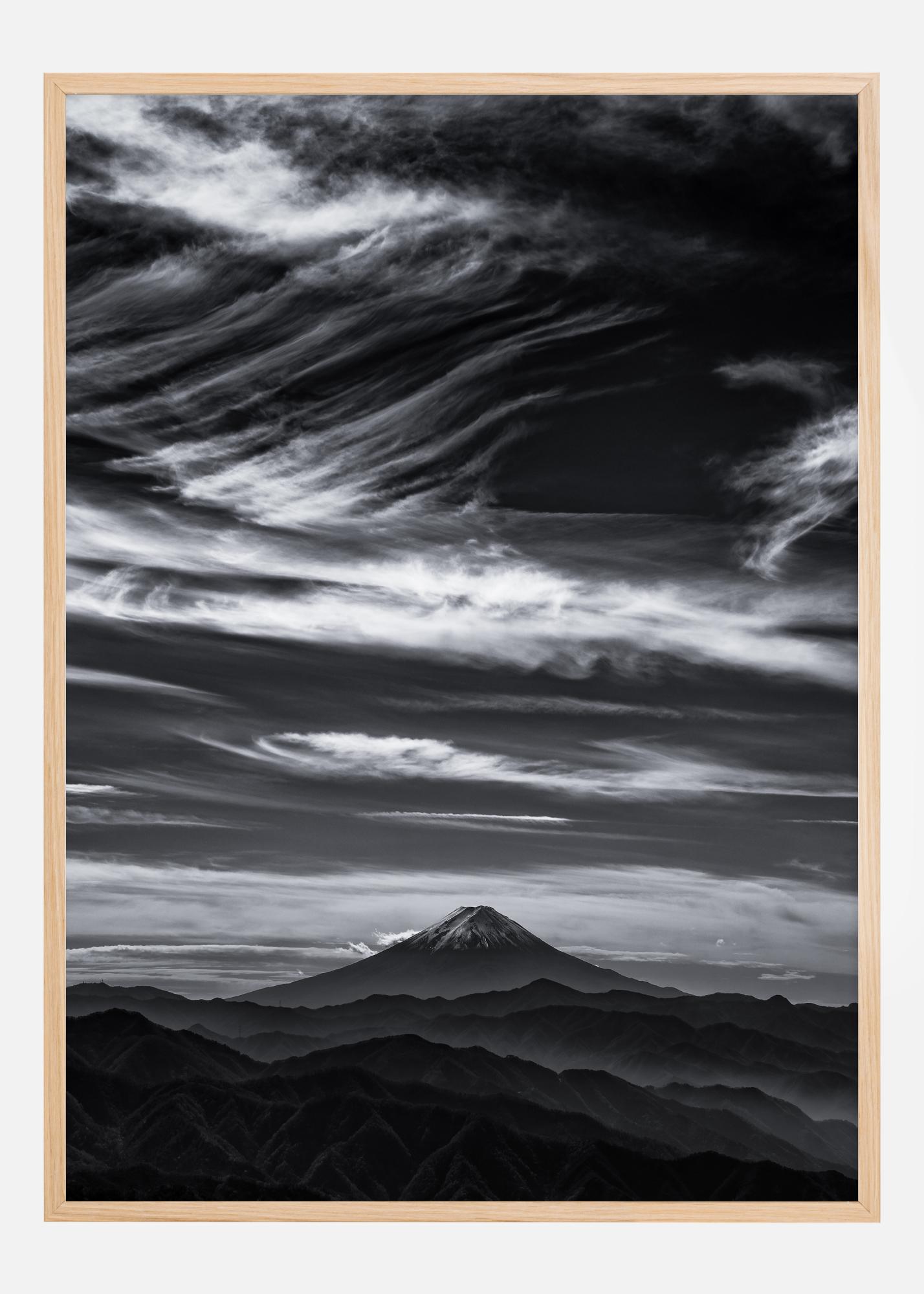 Ovaj poster je sjajan crno-bijeli prikaz kultne planine Fuji, obuhvaÄene dramatiÄnom igrom oblaka i vjetrova na nebu iznad. Kontrast izmeÄu tamnih, rebrastih planinskih lanaca i mekog neba daje snažan i dinamiÄan vizualni dojam, koji je bezvremenski i oÄaravajuÄi.