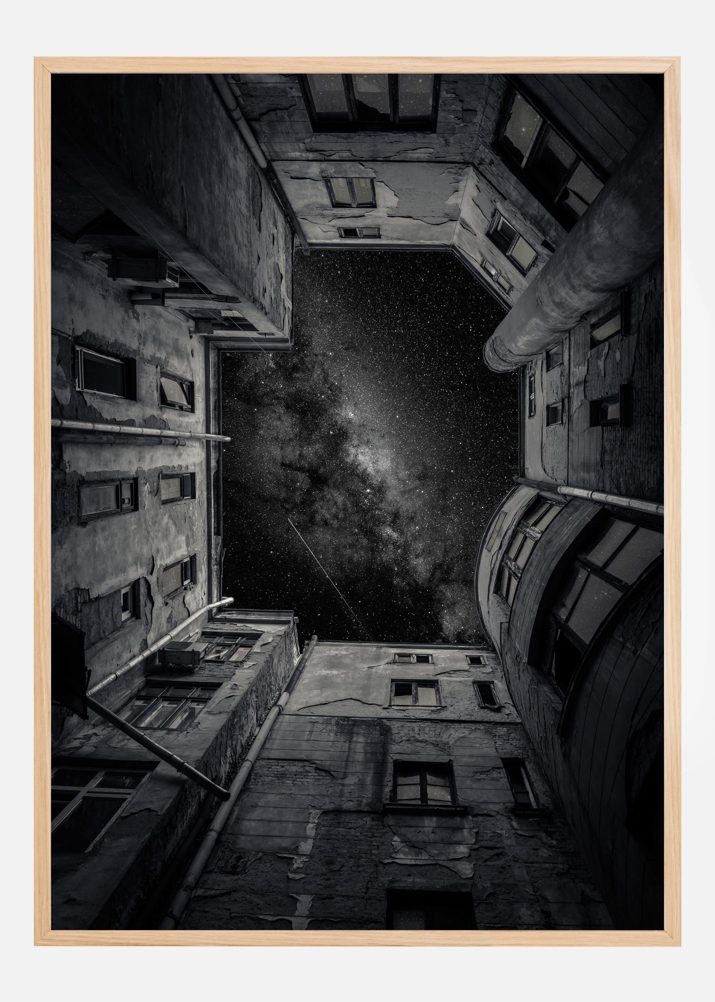 Ova fotografija nudi jedinstvenu perspektivu koja privlači pogled promatrača prema starim pročeljima zgrada prema zvjezdanom nebu. Tamni tonovi i teksture na zgradama daju osjećaj povijesti i protoka vremena, dok zvijezde iznad dodaju osjećaj vječnosti i beskonačnosti.