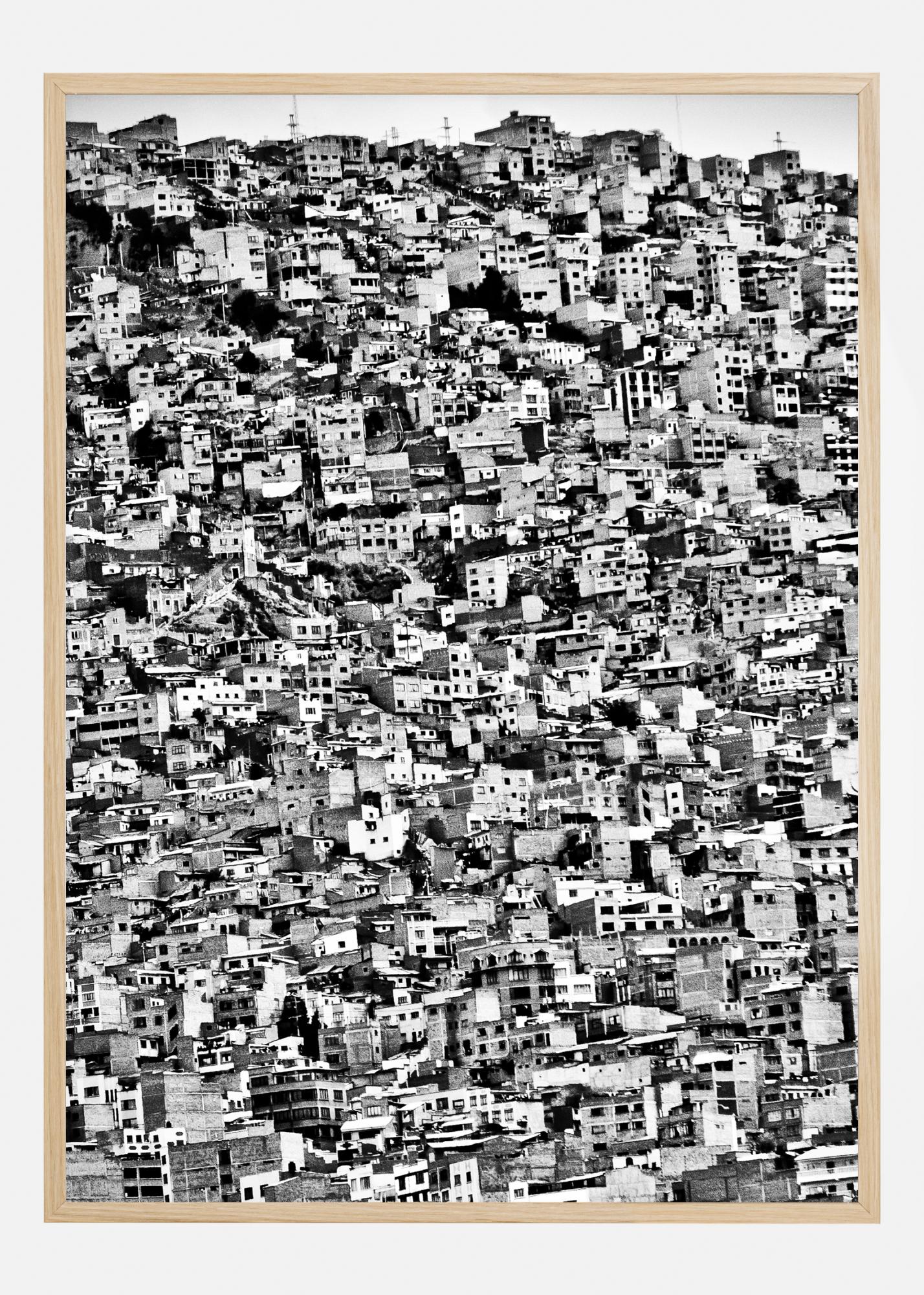 Poster s gradskim pejzažem sa stotinama malih kuća u El Alto La Paz Favela u Boliviji. Slika je ispunjena bijelim pročeljima kuća i njihovim otvorenim crnim prozorima, stvarajući nemirnu, ali fascinantnu sliku. Izgubite se u labirintu kuća kada obješte ovu fotografiju u svom domu.