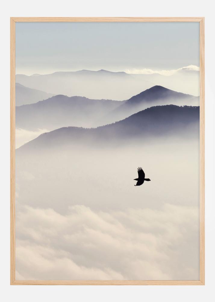 Ovaj poster inspiriran prirodom hvata jednostavnu, ali ipak snažnu sliku slobode i tišine. Usamljena ptica veličanstveno jedri iznad maglovite doline, s planinskim slojevima koji postupno nestaju u mekom svjetlu zore ili sumraka. Mekane tonove i minimalistički krajolik pružaju osjećaj mira i neograničene slobode.