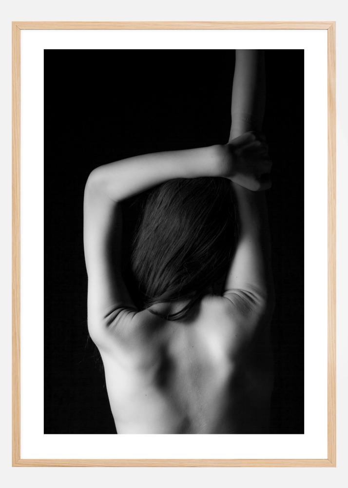 Portretni poster sa leđima žene. Ova crno-bijela slika ističe ravnomjerne mišiće leđa dok podiže jednu ruku visoko i savija drugu ruku preko glave. Dijelovi nje su obavijeni sjenom. Objesite ovo djelo kod kuće kako biste dobili pomalo umjetnički dojam.