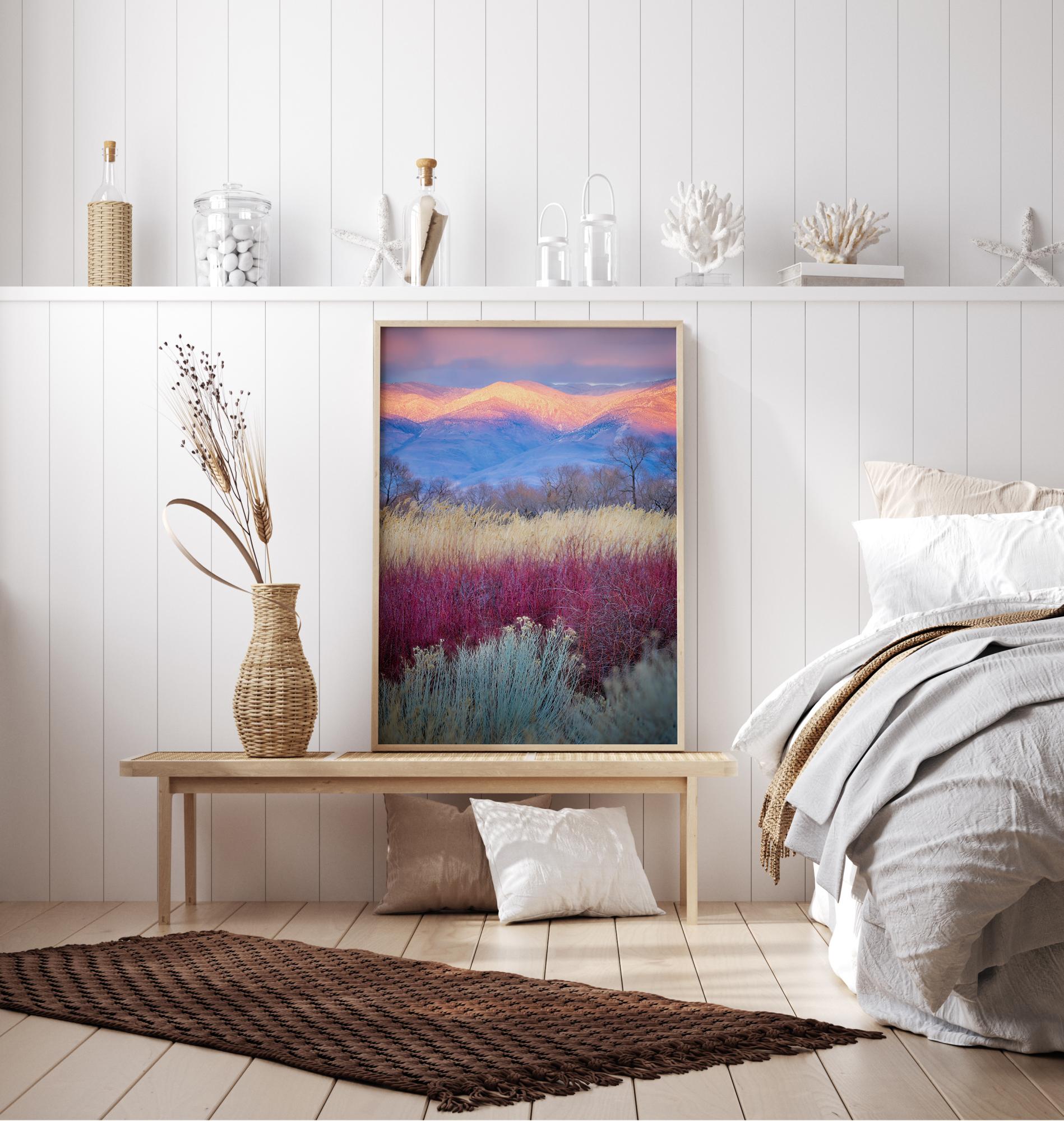Šareni poster polja koja se protežu prema udaljenim planinama. Svijetle boje vode pogled od zelene, ružičaste, žute, plave do narančaste. Sunce samo proviruje iznad planina u daljini. Osjetite rano jutarnje svjetlo i novi dan u ovom djelu.