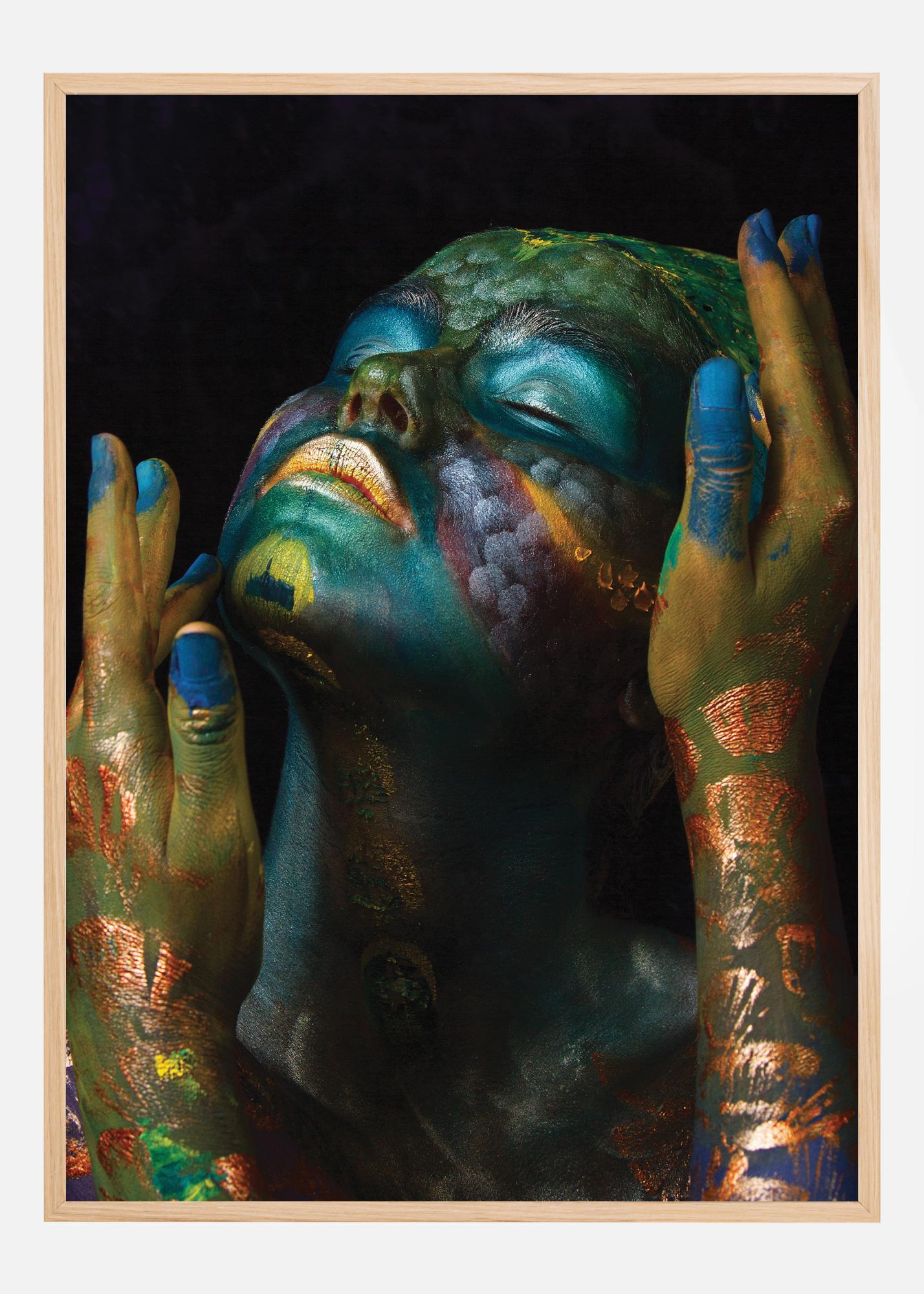 Šarena portretna poster s ženom koja naginje glavu unatrag i uokviruje svoje lice rukama. Prekrivena je sjajnim, jakim bojama koje stvaraju prekrasnu mješavinu divlje šarenosti. Odaberite jednu od boja na slici i uskladite je sa zidom za dodatnu izražajnost.