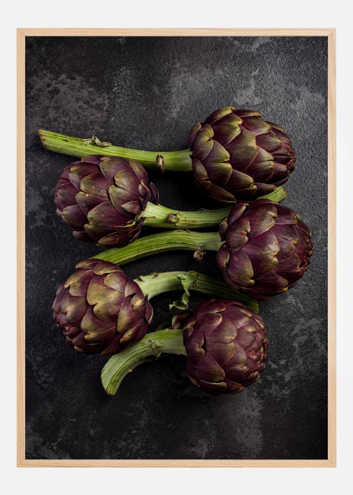 Ovaj rustikalni i prirodom inspirirani poster prikazuje pet artičoka bogatih nijansama na tamnoj, teksturiranoj pozadini. Krupni plan fotografije ističe dubokozelene i purpurnocrvene nijanse artičoka, a zemljani motiv bi se dobro uklopio u kuhinju ili blagovaonicu gdje može inspirirati kulinarske avanture. Ovaj print nije samo omaž ljepoti prirode već i podsjetnik na sposobnost svježe hrane da zbližava ljude.