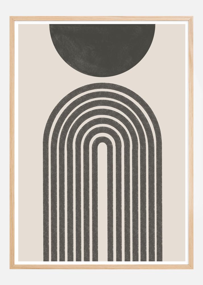 Ovaj umjetniÄki poster prikazuje spajanje geometrijske preciznosti i organske mekoÄe. Gornji dio dizajna Äini crni polukrug koji isijava umirujuÄe prisustvo prema toploj, neutralnoj pozadini. Ispod toga, uzdiže se niz crnih lukova koji harmonijski oblikuju oblik nalik portalu, stvarajuÄi kontrast izmeÄu stroge geometrije i apstraktnih krivulja crnog kruga. Jednostavna shema boja s crnom na off-white pozadini daje moderan i elegantan dojam, savrÅ¡en za suvremeni dom ili ured.