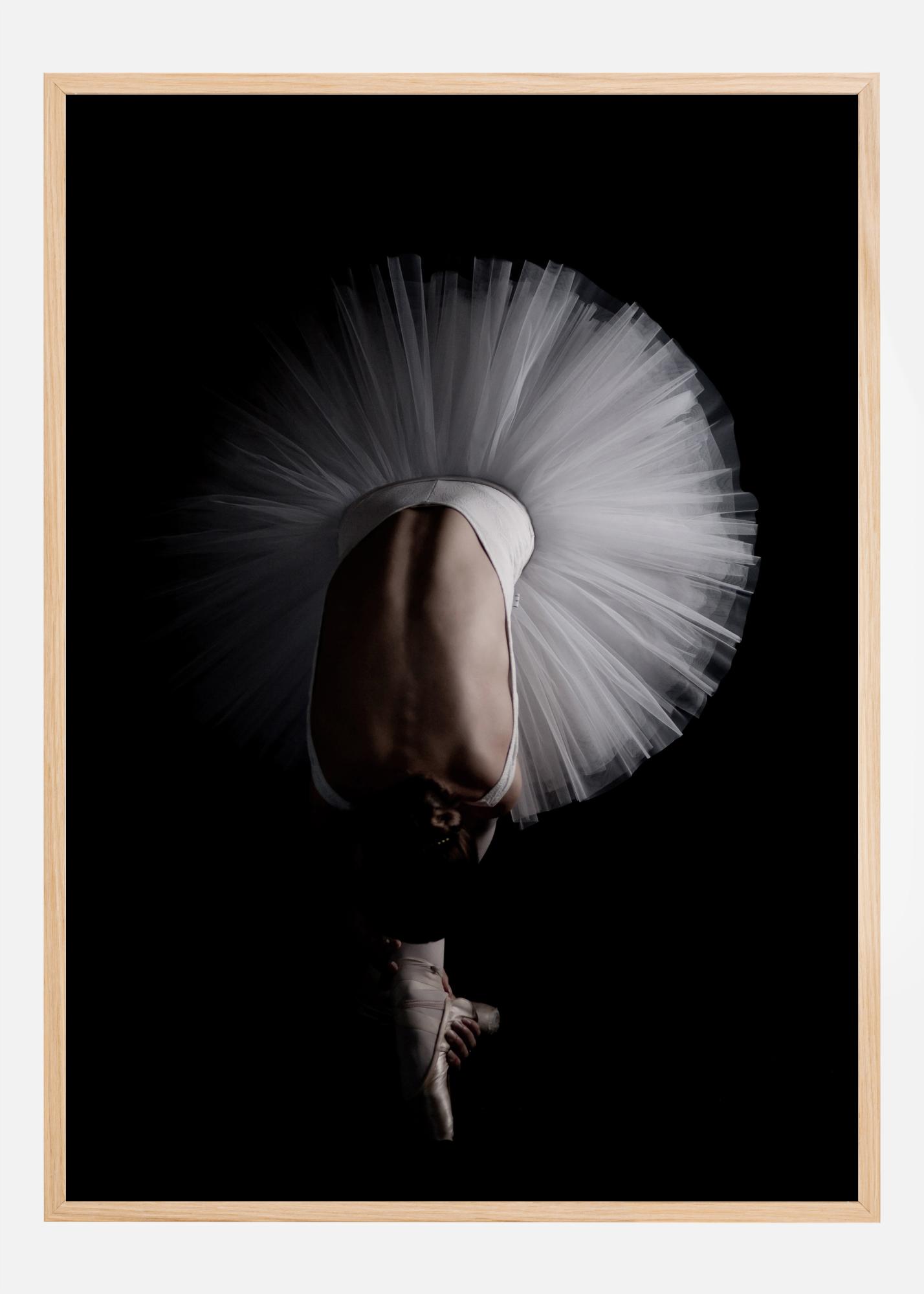 Dramatičan poster iz zraka s balerina koja se naginje naprijed kako bi dosegnula svoje cipele. Crna pozadina čini da bijela baletna suknja ističe u svijetlom krugu oko nje. Snažne linije na leđima vode oko prema elegantno usmjerenim stopalima. Elegancija i drama spajaju se u ovoj jedinstvenoj slici.