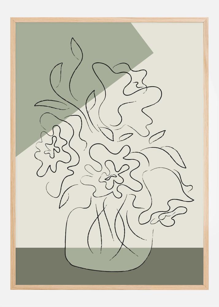 Ovaj umjetnički apstraktni poster prikazuje stilizirane latice cvijeta i lišće u elegantnom, tečnom crtežu linijâ, koje lebdi iznad dvobojne pozadine u nježnim zelenim i neutralnim tonovima. Jednostavna ljepota dizajna, pojačana blagom teksturom koja daje organski osjećaj, stvara opuštenu i mirnu atmosferu. Ovaj moderan i elegantan print savršeno bi se uklopio u minimalističi ili skandinavski inspiriran dom, i dodao bi dodir mira prirode bez da previše preplavi prostor bojom ili složenošću.