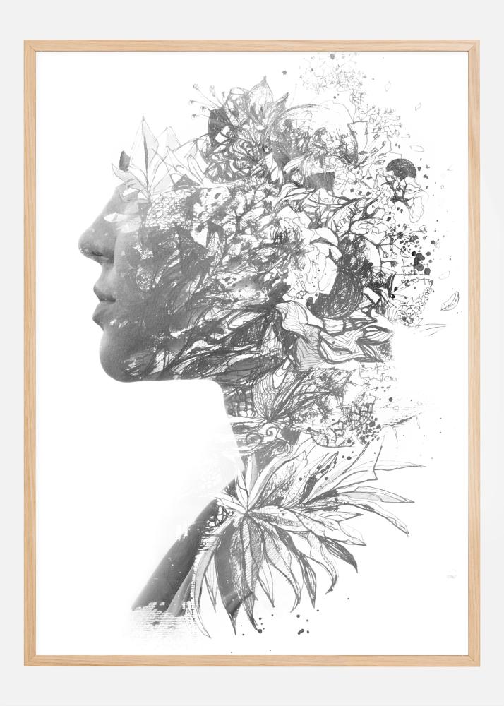 Ovaj umjetniÄki poster kombinira profil žene s detaljnom i složenom ilustracijom cvijeÄa i biljaka, stvarajuÄi fascinantnu fuziju ljudske figure i suptilnih prirodnih detalja. Crno-bijela shema boja daje bezvremenski osjeÄaj i naglaÅ¡ava suptilnu teksturu i složenost kako ljudske figure, tako i cvjetnih motiva.
