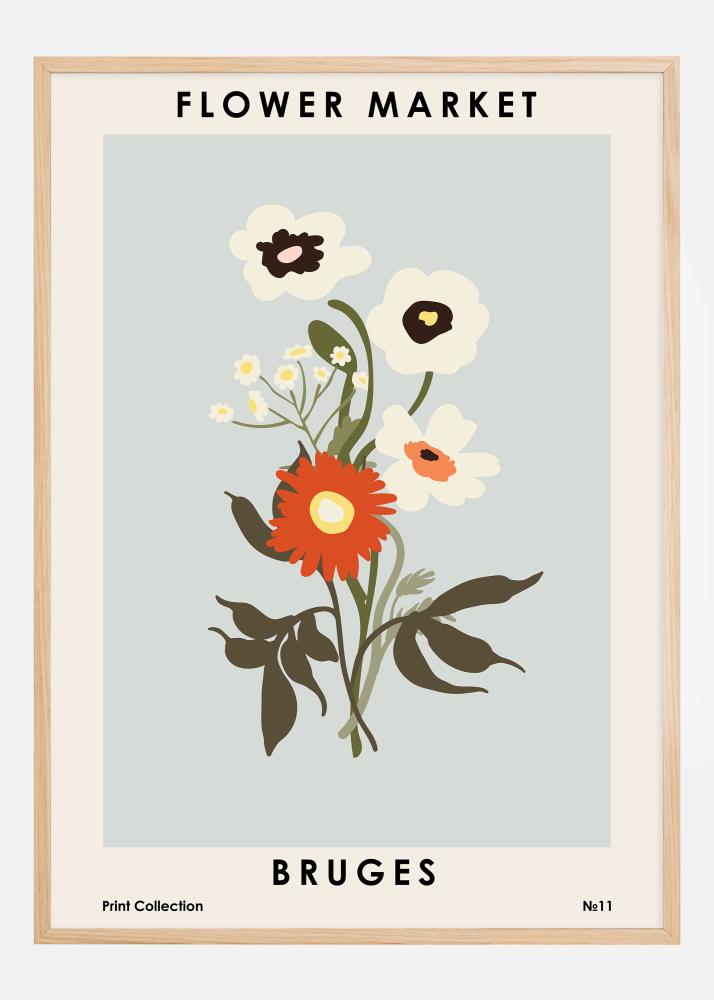 Ovaj šarmantni plakat iz naše kolekcije 'Tržnica cvijeća' predstavlja osebujan izbor cvijeća koji hvata bit slikovite i povijesne atmosfere Bruggea. Sa šarmantnom zbirkom cvijeća u nijansama sunčano žute, duboko narančaste i nježno bijele koja se ističe na prigušenoj sivo-plavoj pozadini, ovaj print nudi estetsku radost koja podsjeća na mirne i šarene cvjetne tržnice u Belgiji.