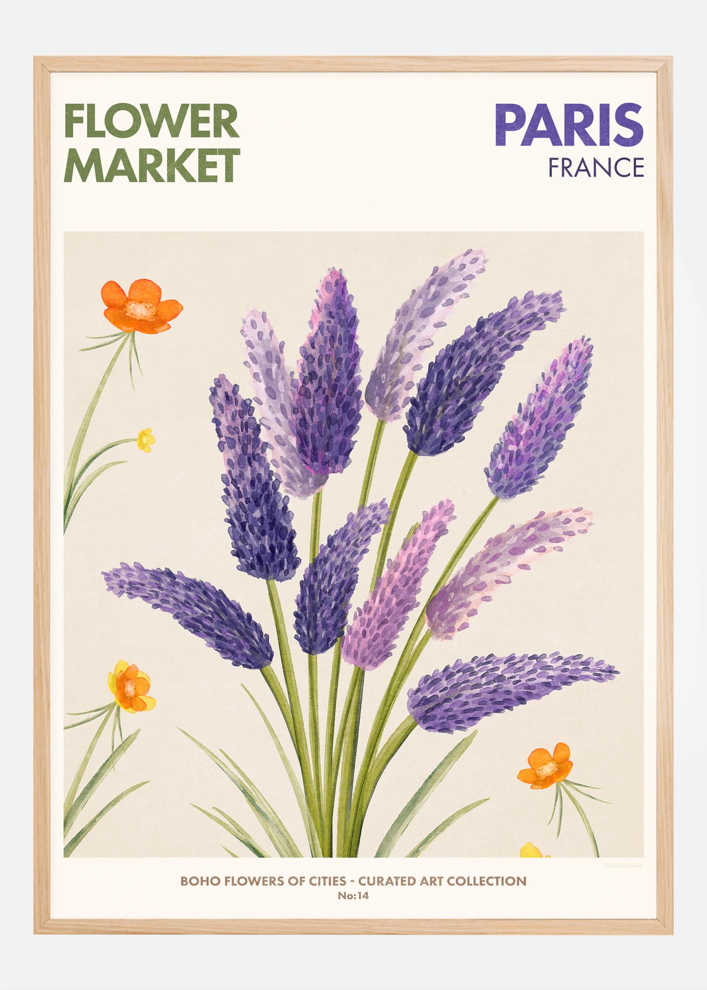 Ovaj print krasi svijetla i živopisna paleta boja koja uključuje nijanse ljubičaste, narančaste i zelene. Prepoznatljivi cvjetovi lavande dominiraju kompozicijom sa svojim nijansama od zasićene ljubičaste do svjetlijih lavandinih tonova, praćeni narančastocrvenim i žutim cvjetovima koji dodaju dodatnu notu boje. Ovaj plakat privlači oko promatrača i stvara osjećaj vječnog proljeća, savršeno odgovarajući svima koji traže umjetničko djelo s ljepotom prirode i osjećajem pariške avanture.