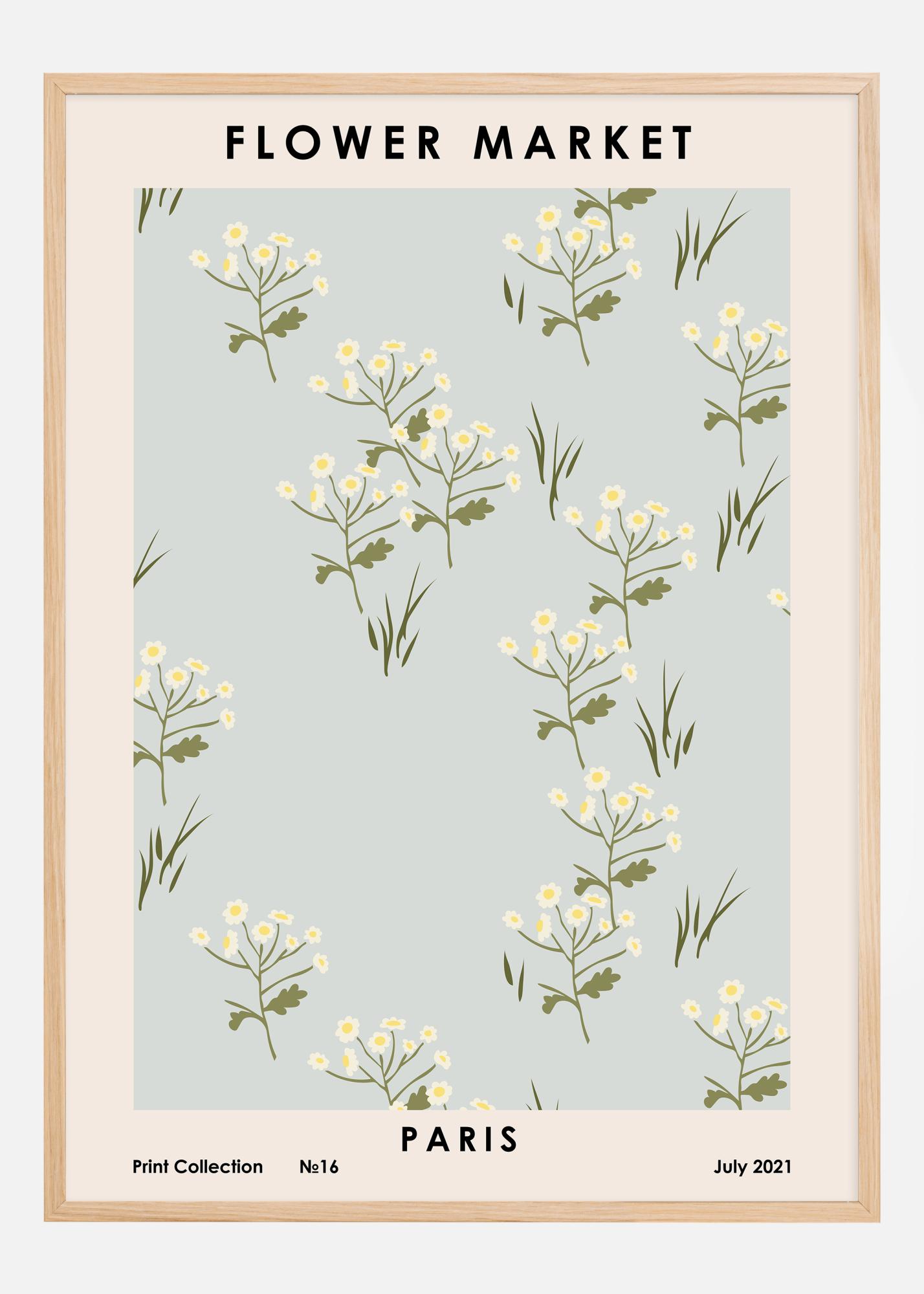 Ovaj šarmantni i stilizirani poster prenosi vas ravno u srce Pariza sa slikom cvjetne tržnice. Prikazuje uzorak delikatnih bijelih cvjetova na umirujućoj sivo-plavoj pozadini, što daje osjećaj svježine i jednostavne elegancije. Na vrhu stoji tekst "FLOWER MARKET" klasičnom tipografijom, dok na dnu sadrži tekst "Print Collection ?16 PARIS July 2021", što pridonosi osjećaju autentičnosti i kulturnog konteksta.