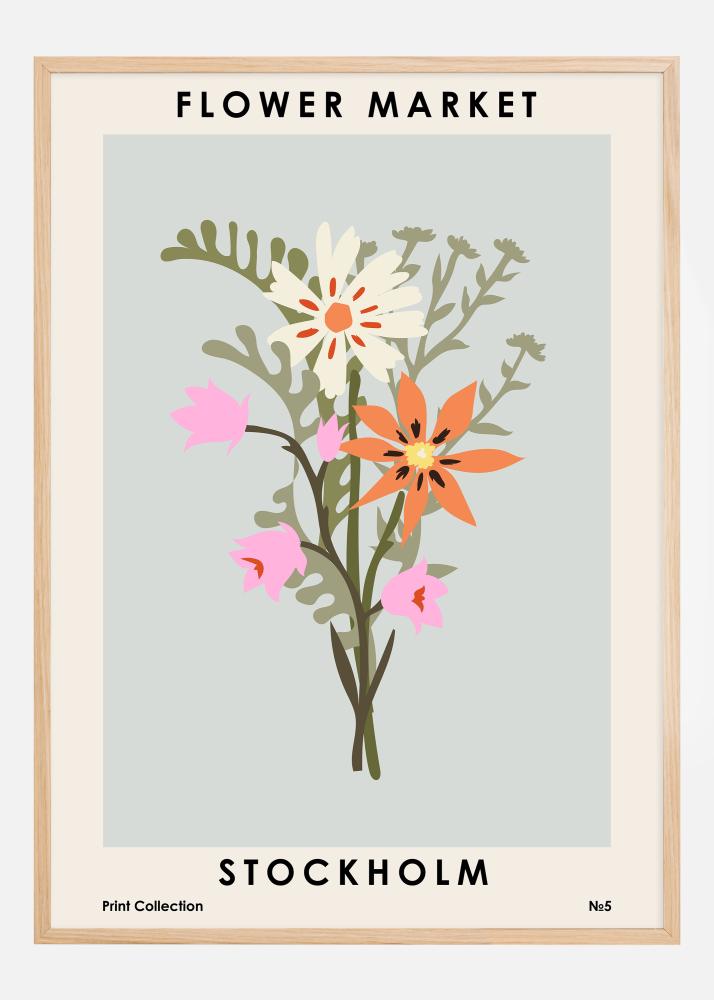 Ovaj poster prikazuje sliku tržnice cvijeća u Stockholmu, s osvježavajućim i prirodnim dizajnom koji uhvati pulsirajuću ljepotu i zelenilo grada. U ovom printu harmonizira igra svjetla između cvijeća i lišća, što daje život procvjetalim motivima ilustriranim u nijansama bijele, ružičaste i narančaste, na nježnoj plavo-sivoj pozadini. To je počast ljubavi skandinavske prijestolnice prema prirodi i njezinoj sposobnosti da spaja tradiciju s modernim dizajnom.