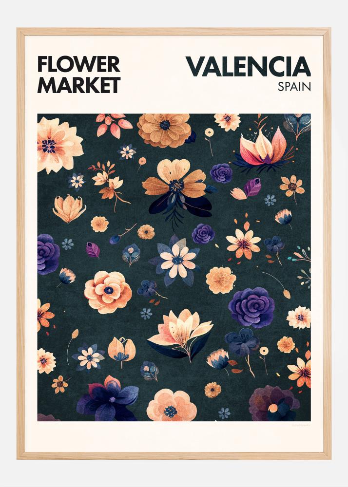 Ovaj živopisan i šarolik poster prikazuje cvjetni sjaj cvjetne tržnice u Valenciji, Španjolska. Detaljizirani motiv odaje počast raznolikosti cvijeća na tržnici, gdje se čini da je svaka vrsta i boja uhvaćena u punom cvatu. Od delikatnih pastelnih do hrabrih, zasićenih boja, dizajn hvata osjećaj bujne oaze usred srca grada.