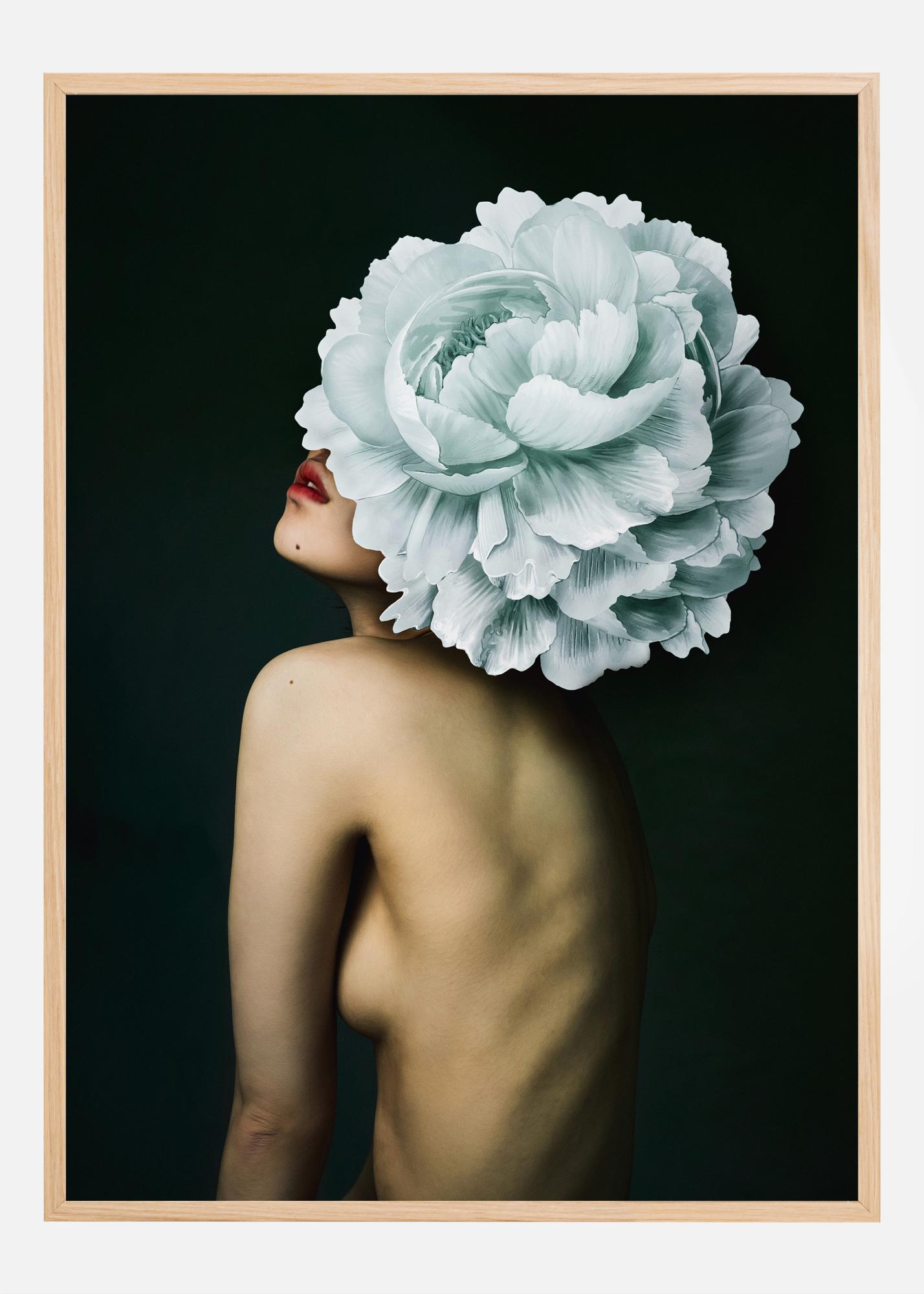 Ovaj poster prikazuje fascinantnu i umjetničku kompoziciju gdje se ljudska ljepota susreće s čudesima prirode. Slika prikazuje osobu gledano s leđa, s glavom zamijenjenom veličanstvenim, gotovo prevelikim bijelim cvijetom. Kontrast između mekane kože i cvijeta bogatog detaljima stvara vizualnu simbiozu koja je i snovita i sugestivna. Shema boja printa je jednostavna ali snažna, s nijansama bijele, boje kože i dubokoj crvenoj boji usana, na tamnoj, gotovo monokromatskoj pozadini.
