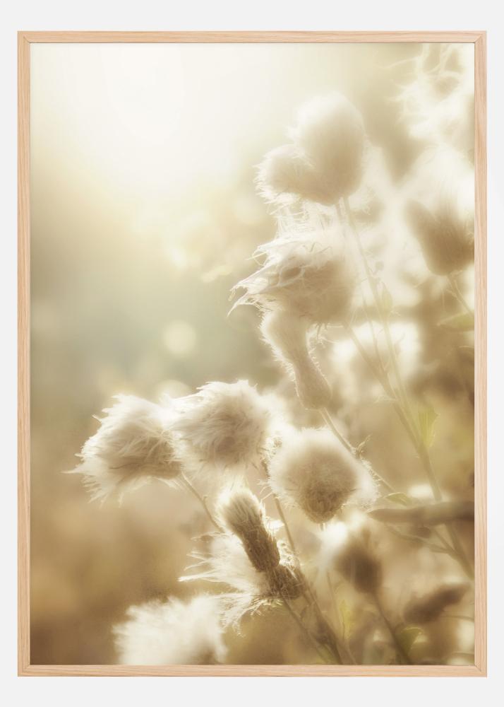 Čarobni poster s pahuljastim cvjetovima u ranom jutarnjem svjetlu. Mekane kuglice na cvjetovima osvijetljene su jutarnjom svjetlošću koja stvara anđeoske aureole oko svakog cvijeta. Mekane pastelne boje pomažu u stvaranju pospanog, čarobnog osjećaja nježnog buđenja.