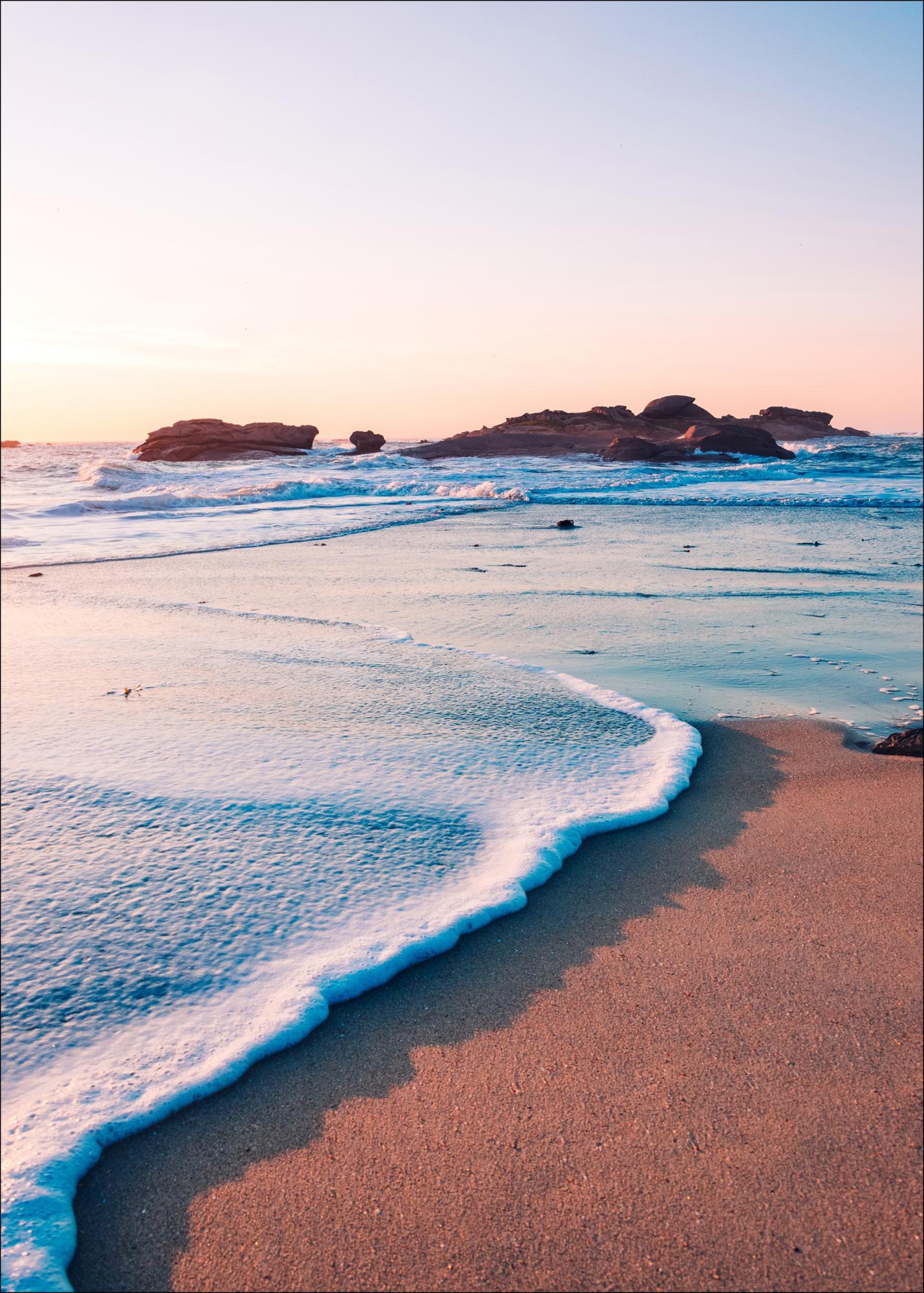 Plakat s prikazom široke plaže na kojoj valovi i more udaraju o obalu. Meko sunčevo svjetlo baca sjene valova na pijesak i stvara mirno okruženje u kojem možete zamisliti da ste sami. Otplovite na svojim snovima uz ovaj prekrasan plakat.
