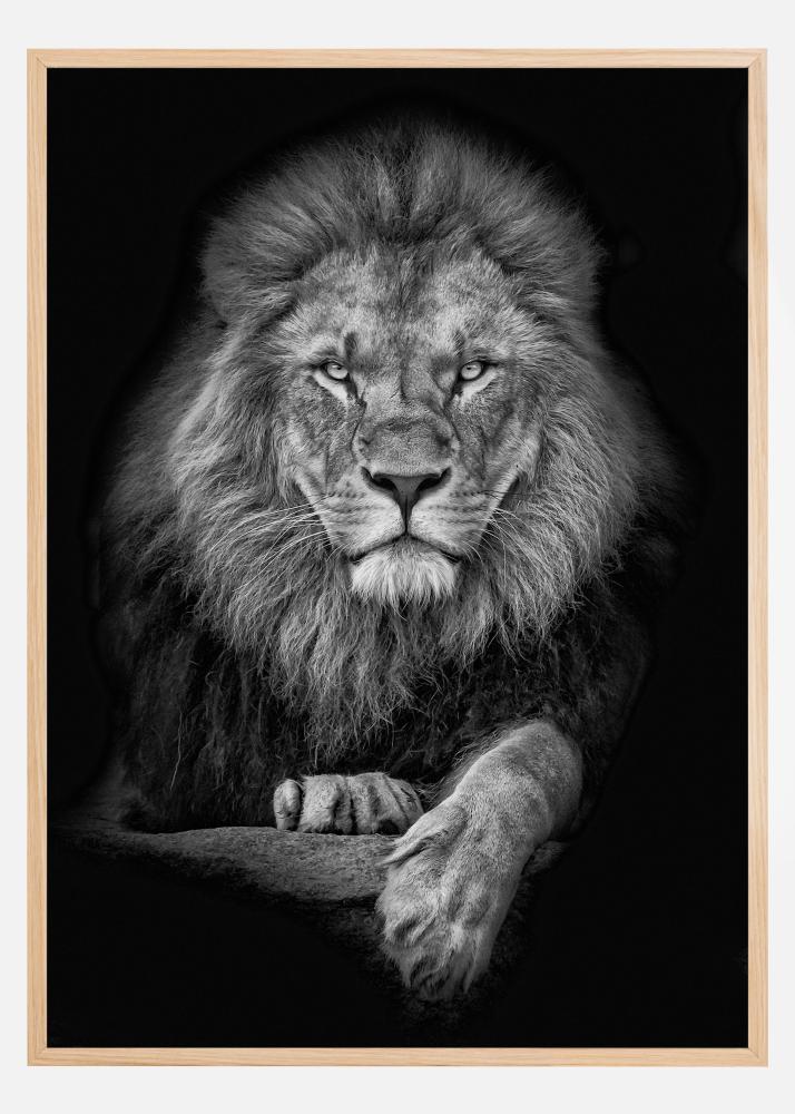 Crno-bijela fotografija iz blizine lava koji gleda ravno prema promatraču. Tamna pozadina i intenzivan pogled stvaraju prekrasnu privlačnost prema platnu. Ovo je poster koji izgleda jednako dobro sam za sebe kao i zajedno s drugim favoritima u većem kolažu.
