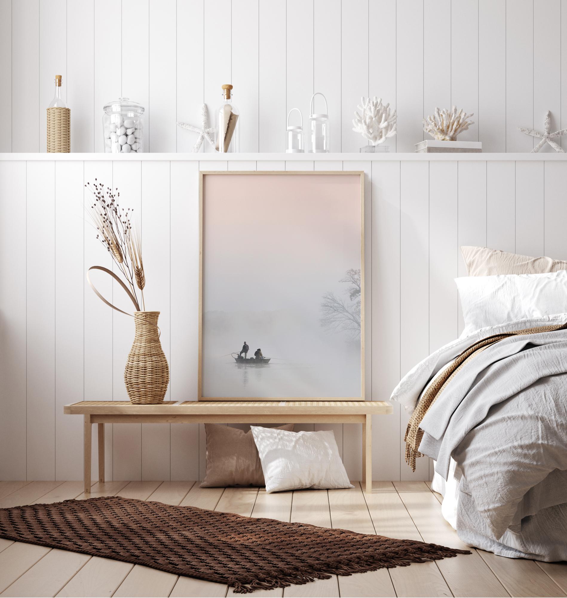 Čarobni poster s dva muškarca koji pecaju u čamcu maglovitog jutra. Mali čamac je lijevo u silueti. Grane drveća mogu se vidjeti desno, ali sve je prekriveno slojem bijele magle koja ovu sliku čini čarobnom. Uživajte u miru ranog jutra uz ovaj poster.