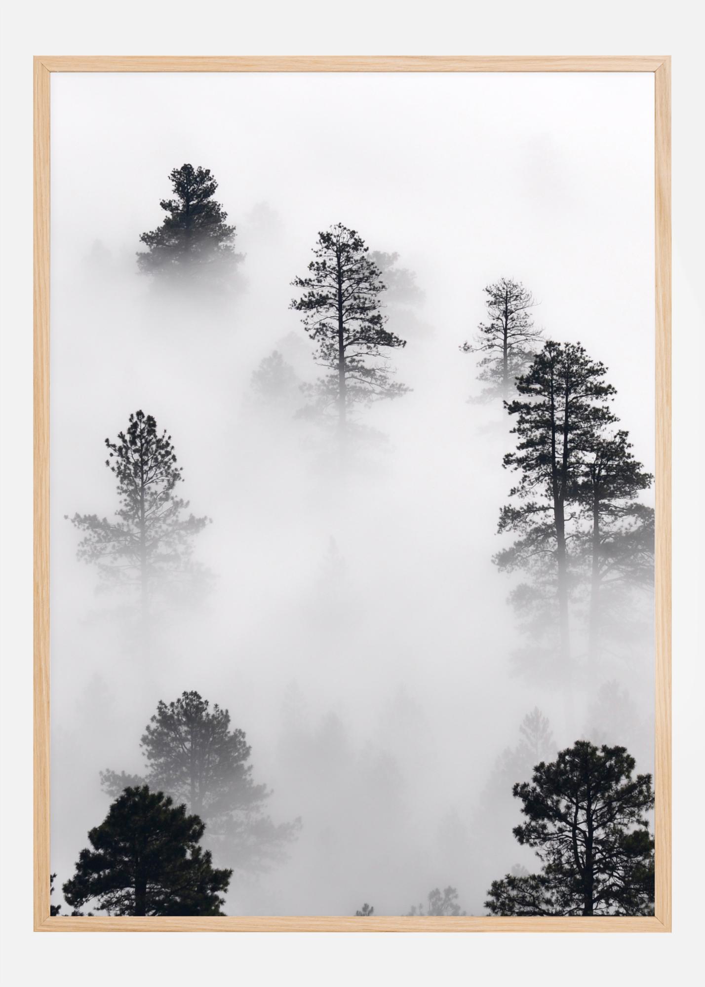 Fantastičan plakat krajolika s šumom u magli. Visoki tamni vrhovi drveća izranjaju iz blijede bijele magle, stvarajući snažan kontrast između magle i drveća. Unesite hladan zimski osjećaj u svoj dom kada ga objesite na neutralni zid.