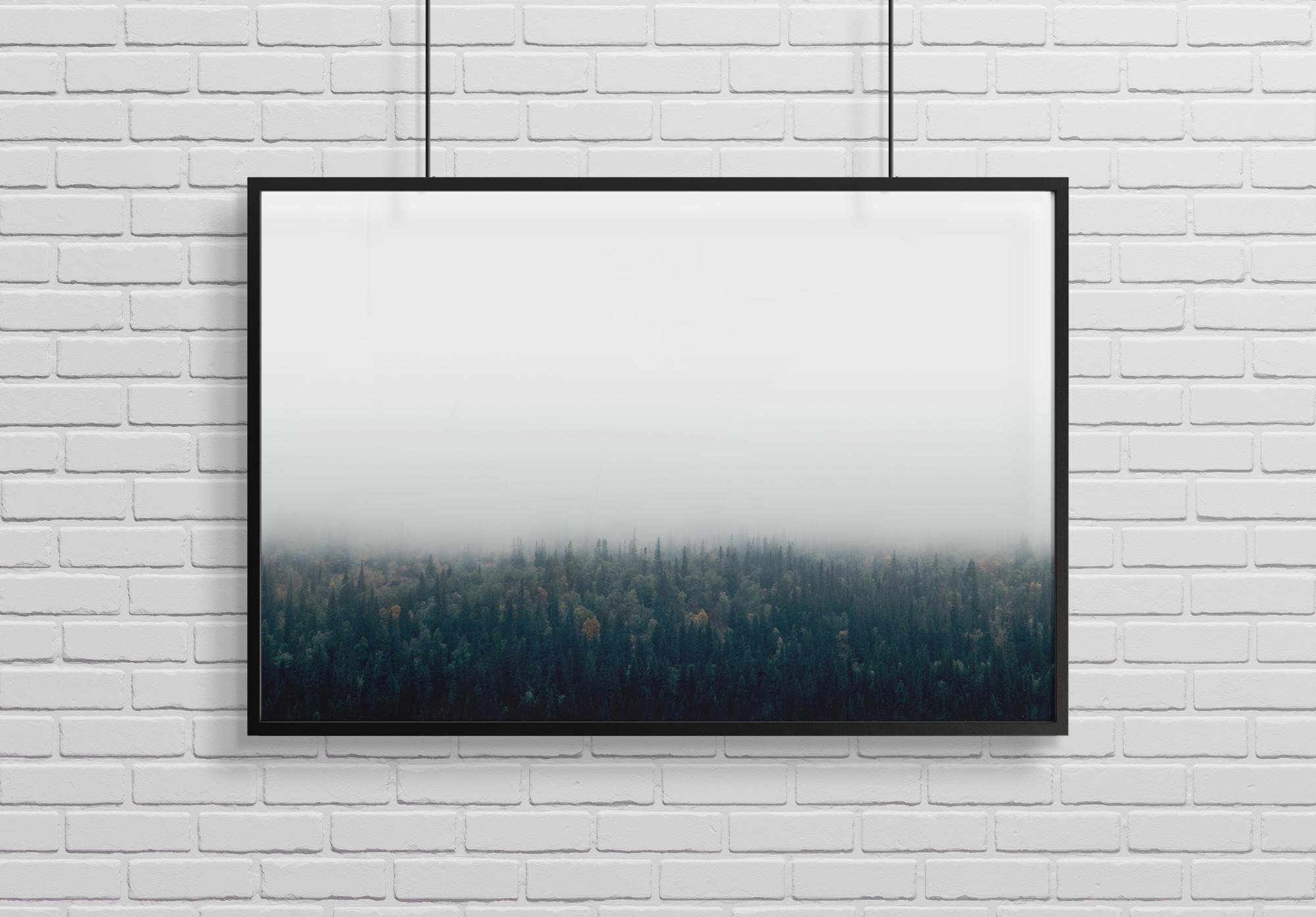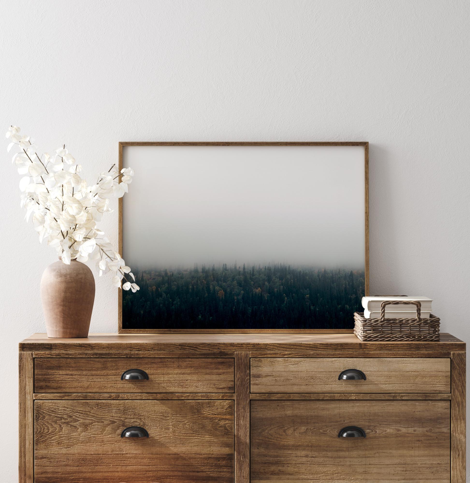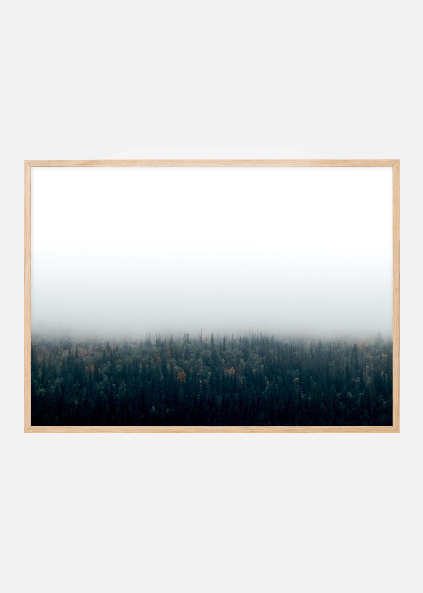 Fotografski poster preko prostrane šume koja počiva pod gustom maglom. Zelena stabla snažno kontrastiraju s bijelim nebom. Prekrasan poster blizak prirodi koji je lako kombinirati s drugim favoritima. Zašto ne napraviti veću zidnu sliku s temom prirode?