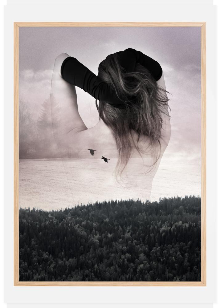 Plakat s kolažom s šumom i nebom pri dnu te ženom u sloju iznad slike. Duh šume je ovdje jasan, jer tamna šuma doseže do neba gdje žena s crnom rukavicom provlači ruku kroz kosu. Uživajte u drugačijem sastavu ove zaista maštovite slike.