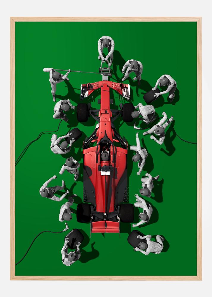 Živopisna zelena pozadina ne samo da pojačava fokus na detaljne sive i bijele kombinacije mehaničara, već i na upečatljivu crvenu boju trkaćeg automobila. Ovaj poster hvata trenutak sabrane koncentracije i brzine koji definira svaku utrku, što ga čini savršenim dodatkom za sve koji vole brzinu i zvuk motora trkaćih automobila. Smjela paleta boja plakata daje mu energiju i snagu da zauzme središnje mjesto u svakoj prostoriji u kojoj je izložen.