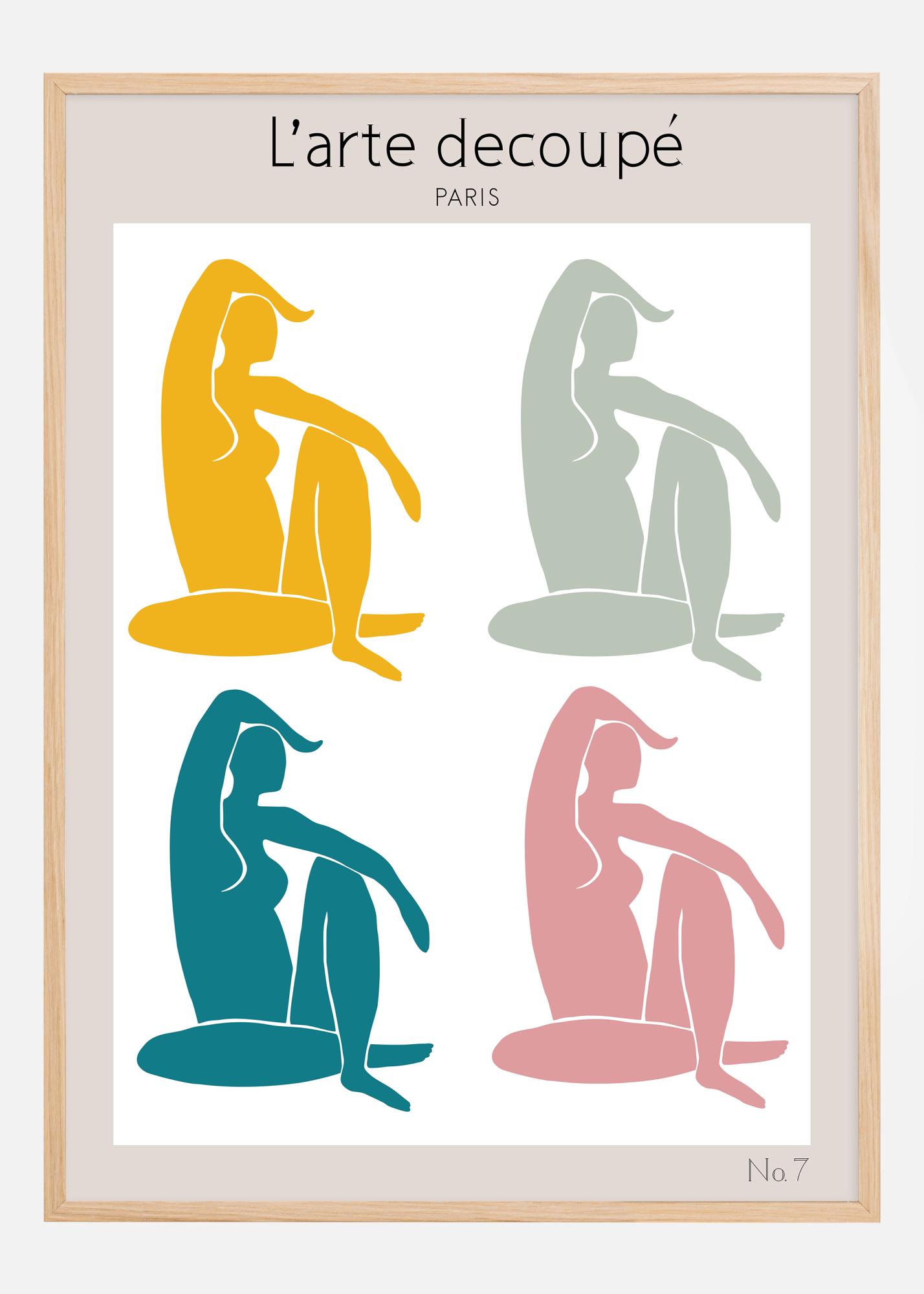 Ovaj šareni i suvremeni plakat iz serije 'L'arte découpé' predstavlja četiri stilizirane figure u dinamičnoj i harmoničnoj kompoziciji. Svaka figura je pažljivo izrađena u različitim bojama - žarkoj žutoj, nebesko plavoj, blagoj zelenoj i toploj ružičastoj - i postavljene su na sivoj pozadini koja pruža smiren i uravnotežen dojam. Ovaj umjetnički print slavi raznolikost i pokret ljudske forme kroz svoj apstraktni i pojednostavljeni dizajn, stvarajući snažan vizualni izraz koji se dobro uklapa u moderan stil uređenja.