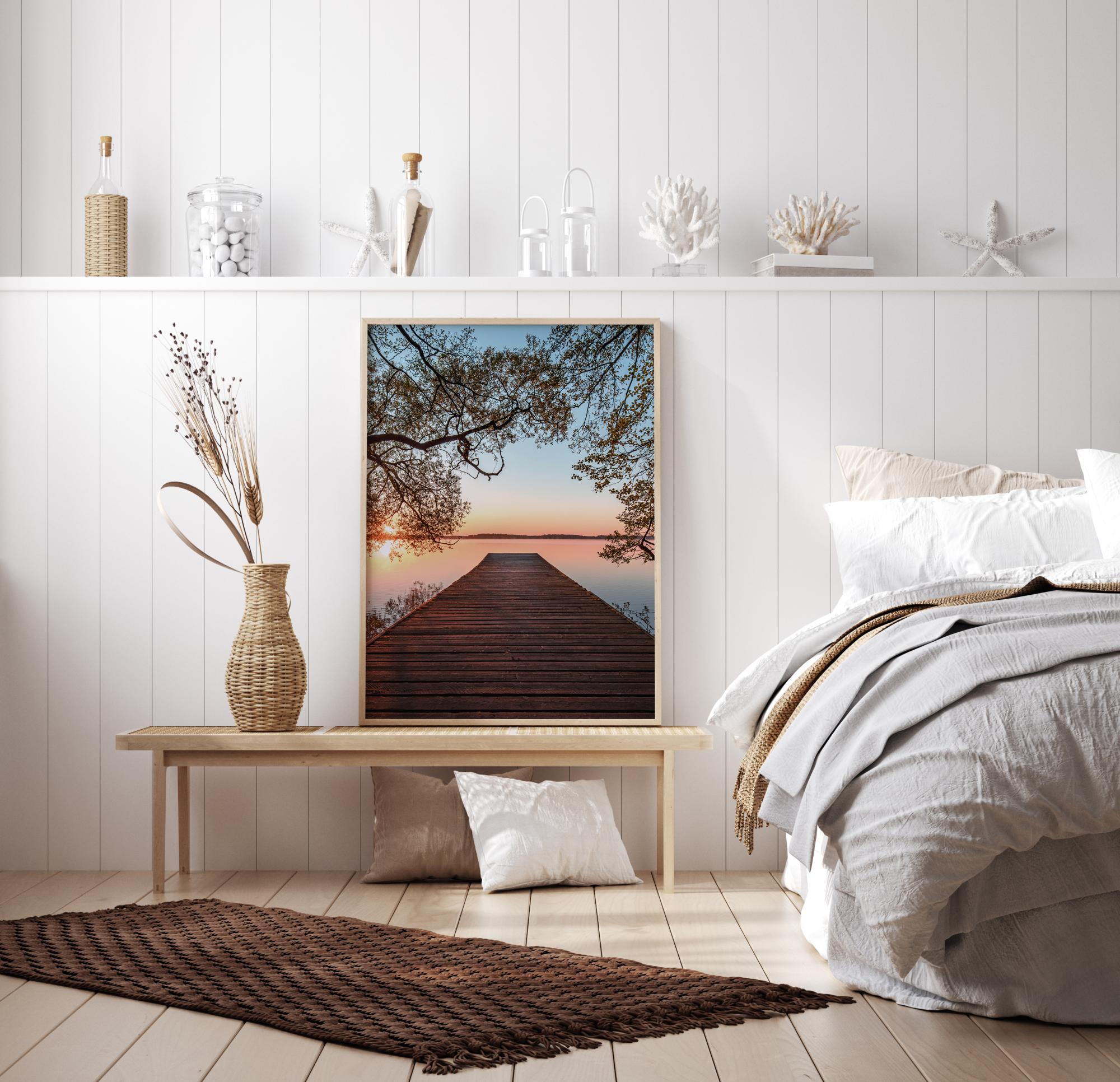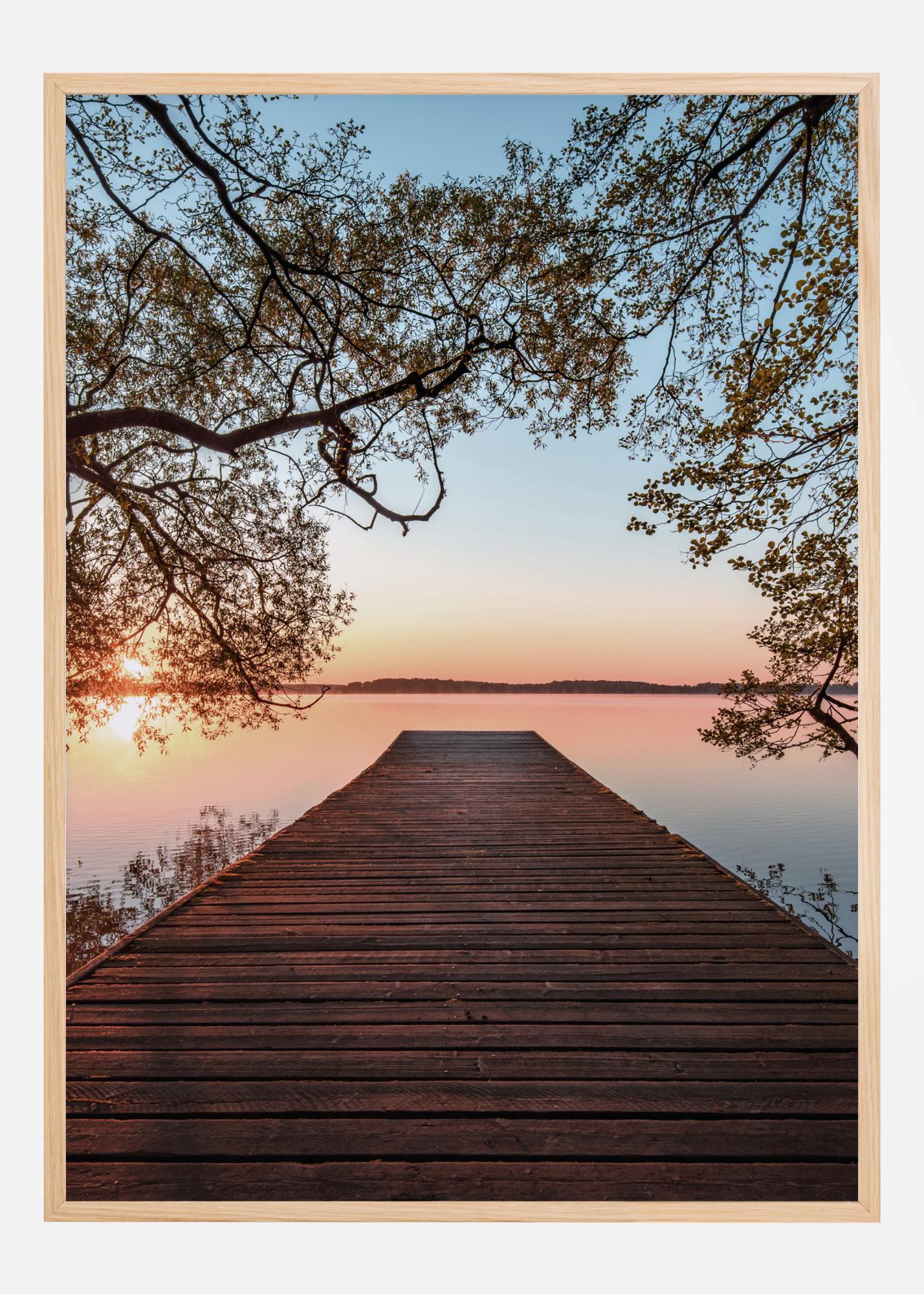 Atmosferski poster s molom koji vodi preko jezera tijekom svijetlog dana. Grane drveća uokviruju mol dok vodi prema nježno plavom i boji breskve jezeru i nebu. Osjetite osjećaj slobode kada donesete ovaj poster kući.