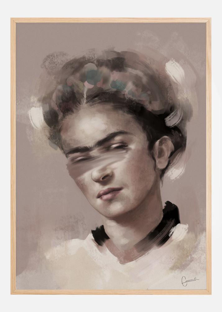Plakat portreta s Fridom Kahlo u nježnim bojama. Mirna i spokojna, ova žena gleda dolje s mirnim izrazom na licu. Njena kosa i koža su u nježnim neutralnim tonovima koji pridonose gotovo anđeoskom osjećaju koji ona pruža. Prikažite svog omiljenog umjetnika s ovim otiskom.