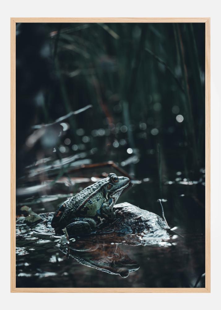 Ovaj očaravajući poster hvata bit mirnog trenutka u prirodi, gdje je usamljena žaba prikazana kako sjedi na kamenu usred tamnog i tajanstvenog jezerca. Zasićene zelene nijanse žabe naglašavaju njezinu živost naspram tamne, maglovite pozadine i svjetlucavih točaka na površini vode. Njezin odraz na mirnoj površini vode pridonosi dubokoj i poticajnoj atmosferi.