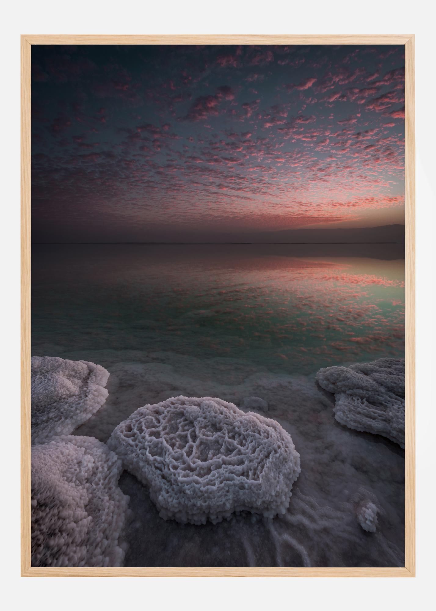 Lijep poster s prostranim jezerom. U prvom planu su se stvorili veliki kristali soli stvarajući fantastične prirodne uzorke. Jezero se proteže prema horizontu dok dramatično crveno i plavo noćno nebo pridonosi čarobnom osjećaju na ovoj slici.