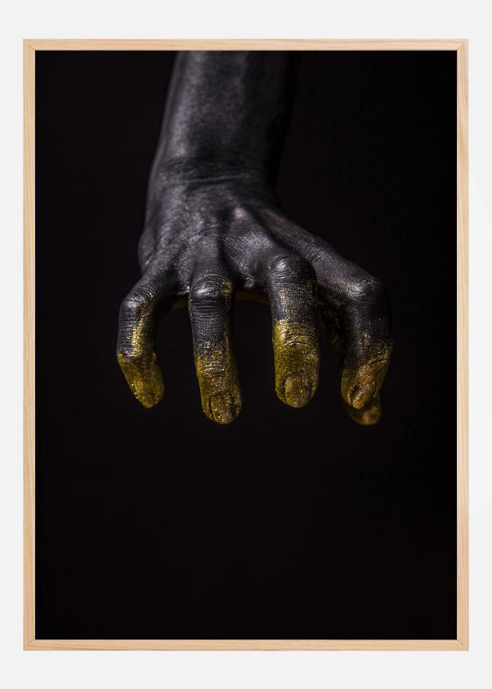 Dramatičan poster ljepljive ruke koja se proteže prema dolje. Crna ruka ulazi odozgo u fotografiju, s prstima savijenim spremnim da uhvate nešto. Vrhovi prstiju su prekriveni sjajnim zlatom kako bi se istaknuli. Dodajte ovu epsku sliku svom domu.