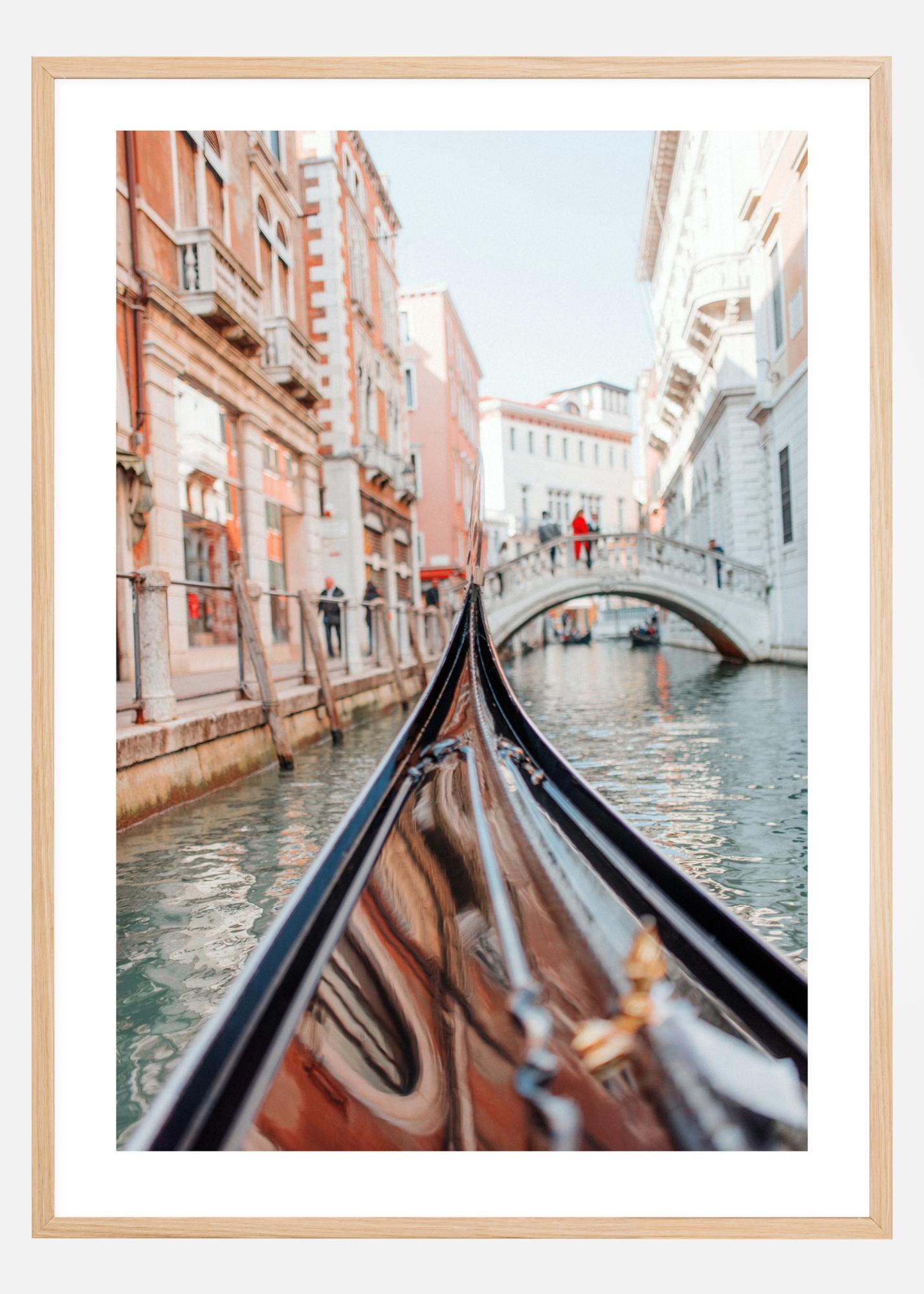 Klasični poster s pramcem gondole koja plovi kroz kanale u Veneciji. Kanal prolazi između nježno ružičastih i bijelih kuća, prema bijelom mostu gdje ljudi stoje i gledaju. Zamislite da ste na odmoru dok ovu sliku nosite kući.