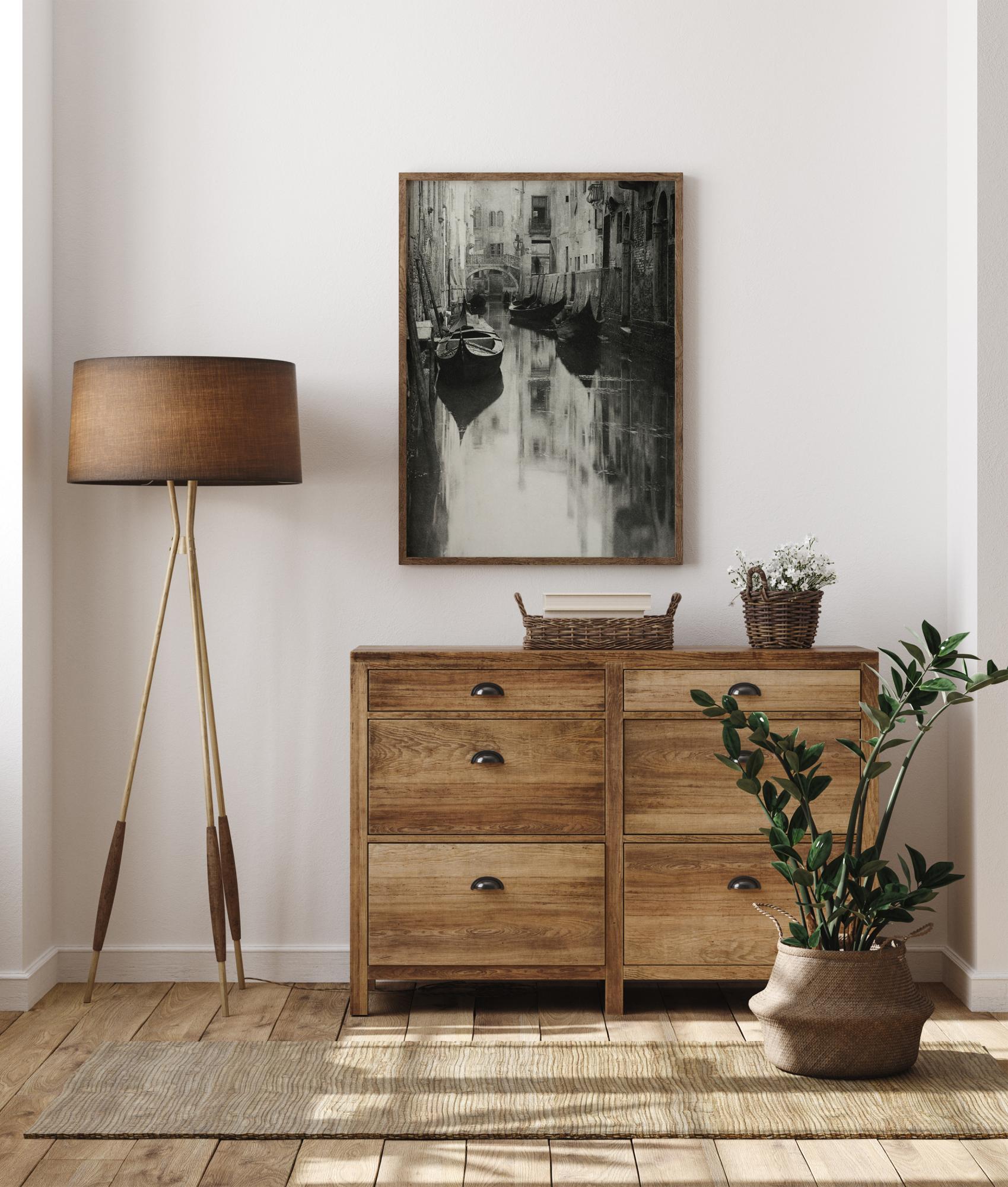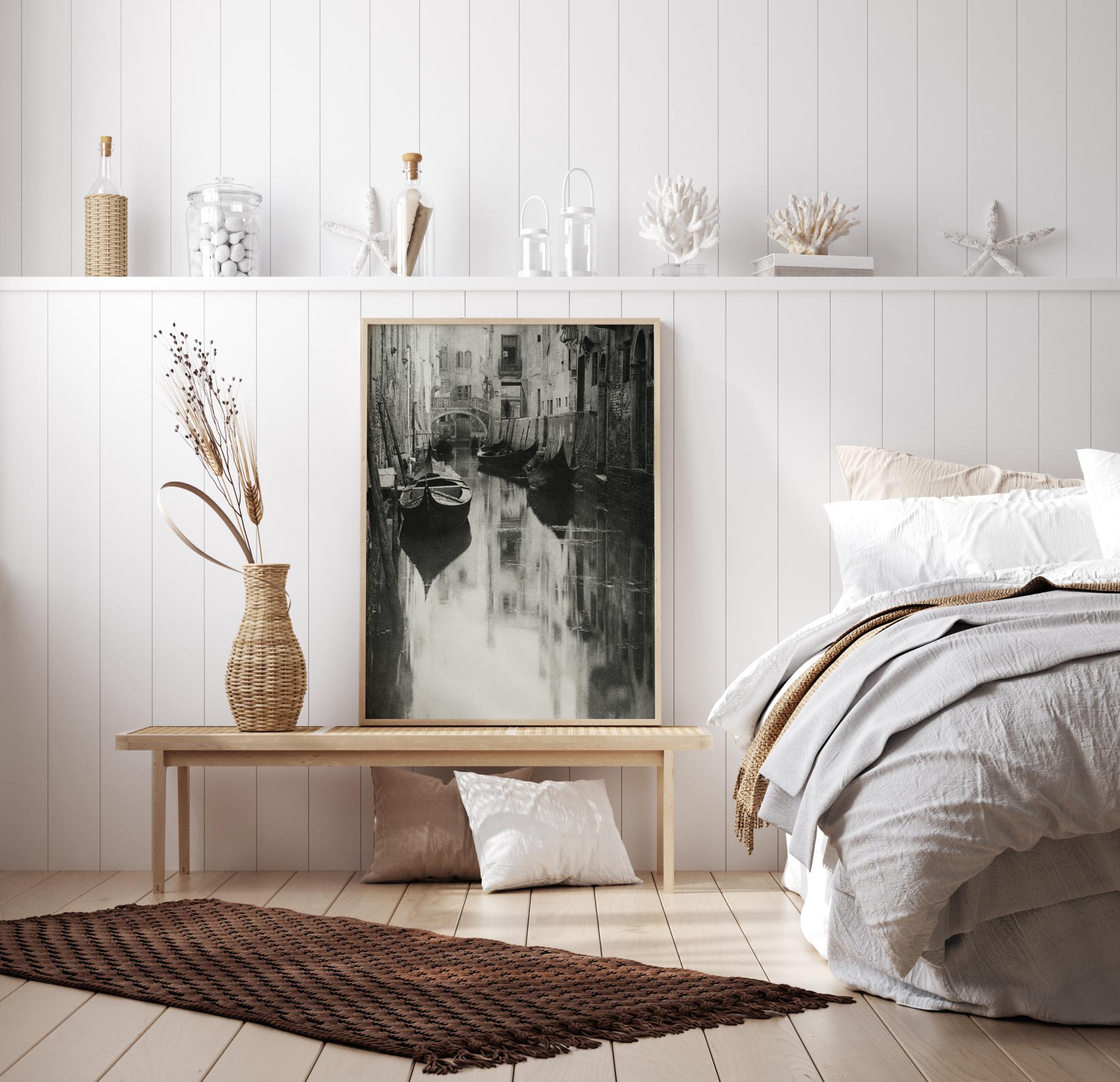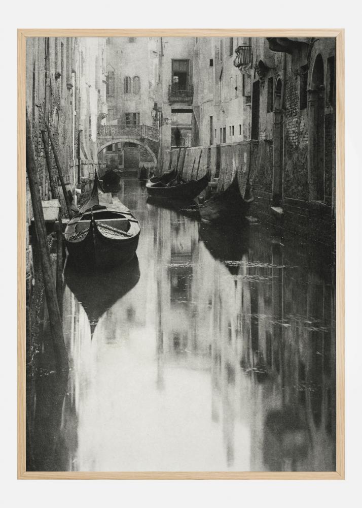 Crno-bijeli poster s gondolama privezanima u kanalu u Veneciji. Čamci miruju na tihom vodama uz strme strane kuća. Slika odiše mirom i tišinom u ovom zabačenom dijelu grada.