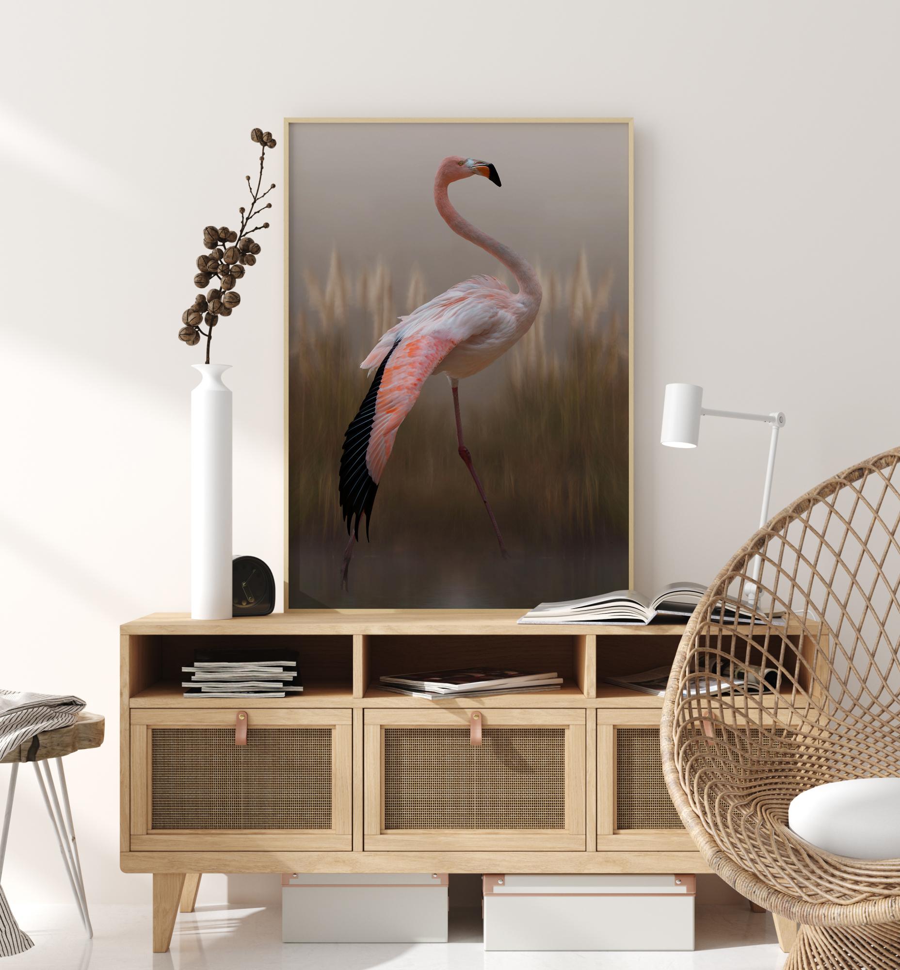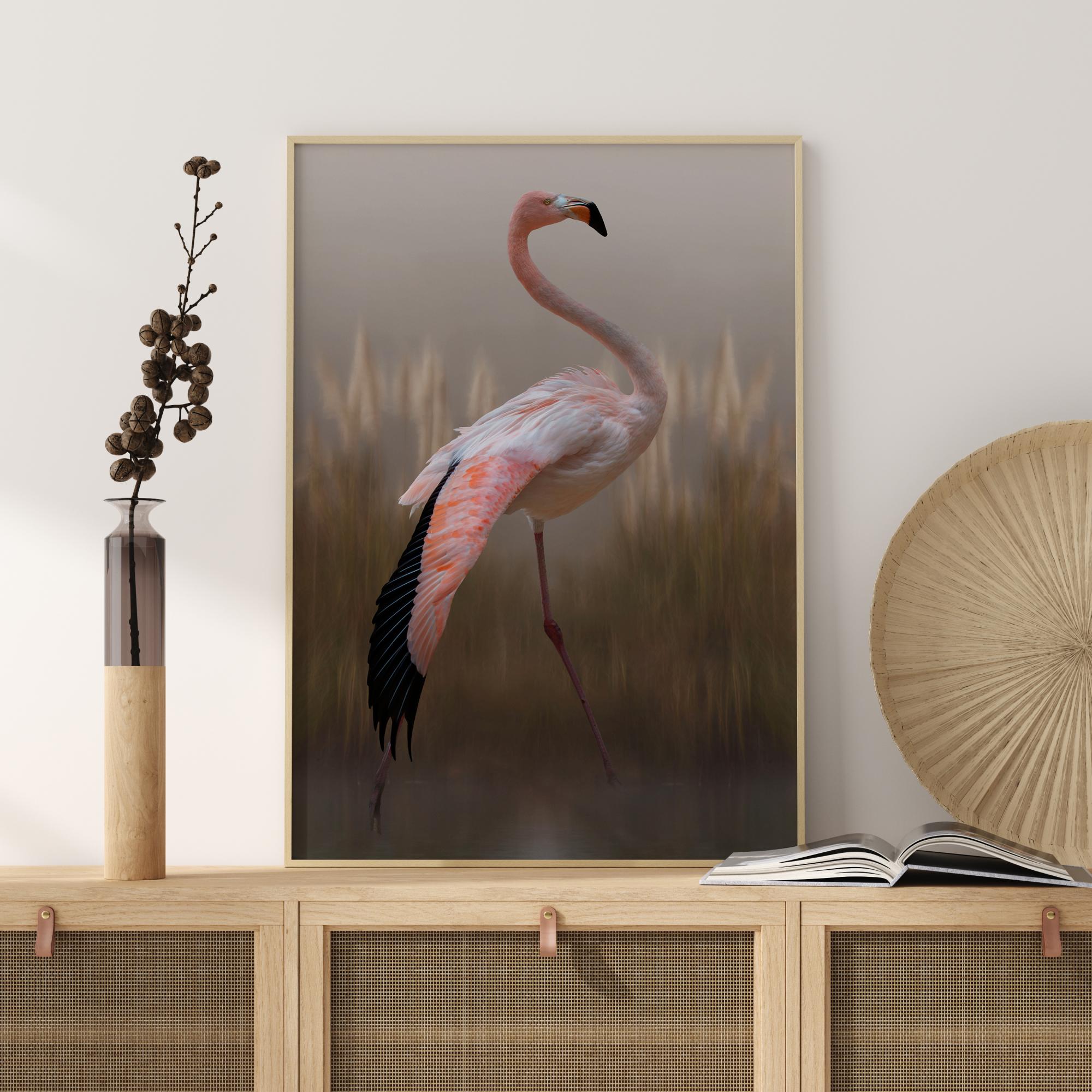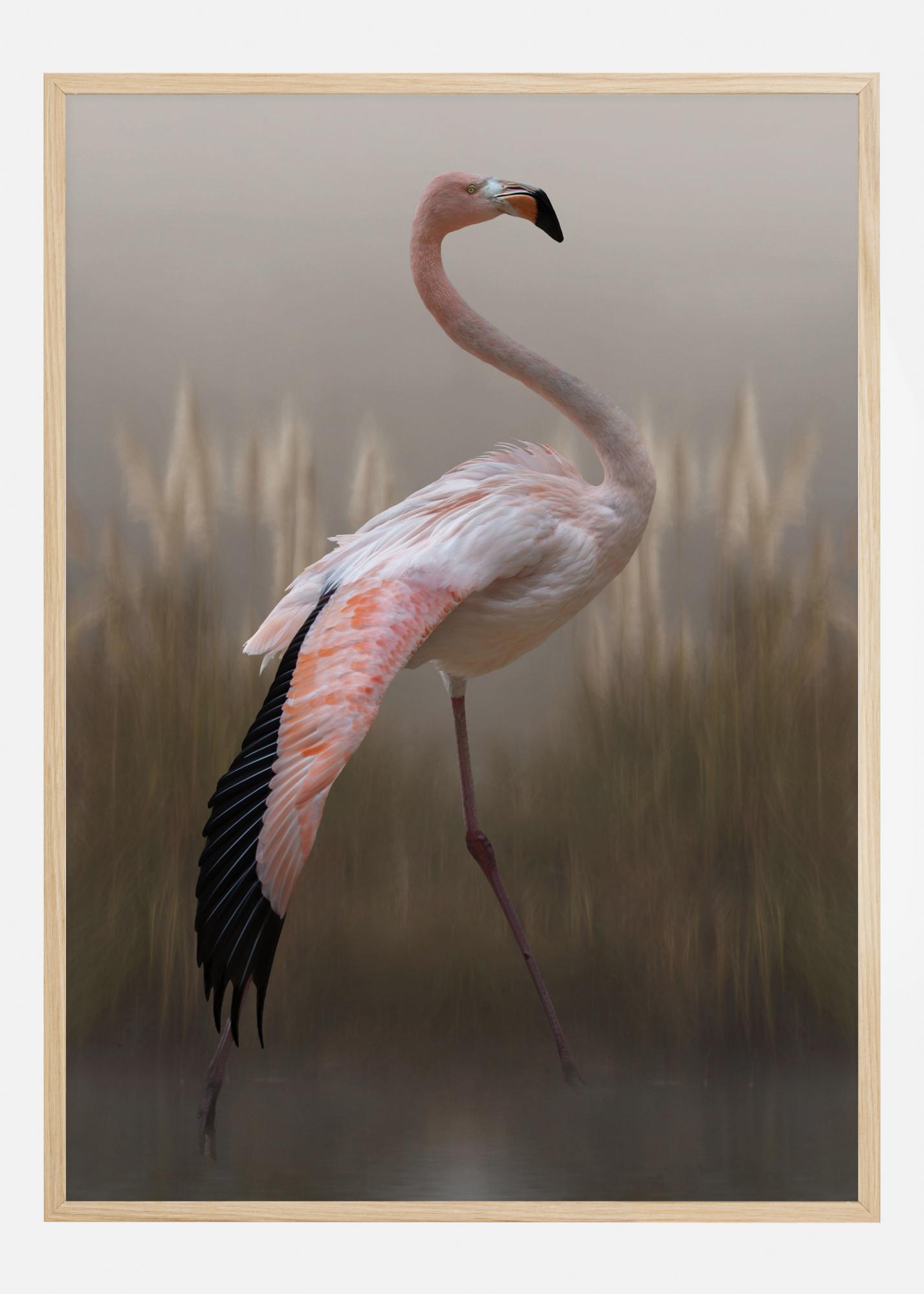 Poster životinje s ružičastim flamingom koji ponosno korača. Nijanse boja i zamagljenje fotografije gotovo daju osjećaj slike. Možete maštati o tome kako koračate zajedno s pticom kada ovu poster kombinirate s jednostavnim plavim zidom.