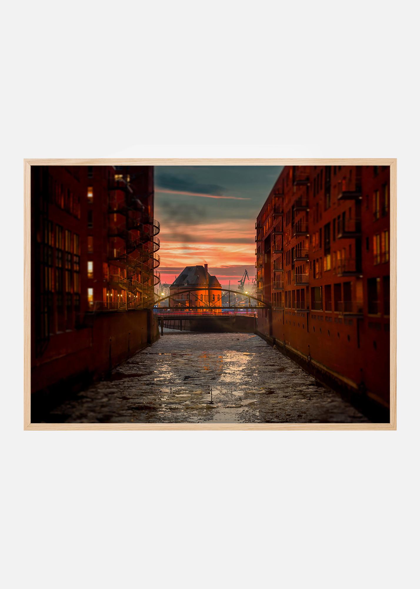 Zalazak sunca nad starom skladiÅ¡nom Äetvrti Speicherstadt u Hamburgu sa svojim kanalima i neogotiÄkim zgradama od opeke. Fotografija iz ovog zaÅ¡tiÄenog arhitektonskog podruÄja savrÅ¡eno se uklapa u dom onih koji su zainteresirani za arhitekturu ili povijest. Plakat najbolje izgleda u tankom metalnom okviru koji odgovara strogoj arhitekturi i lijepo se istiÄe na zidu uz druge gradske slike.