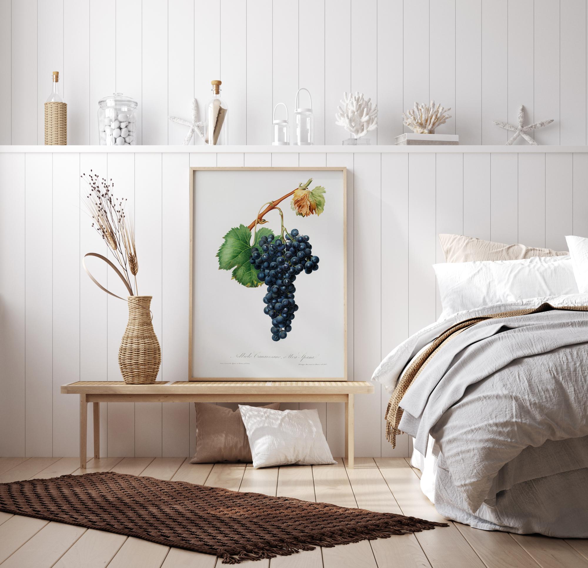 Detaljan botanički poster s mnogo tamnoplavih grožđa na lozi koja visi u sredini na bijeloj pozadini. Sjajna crnoplava grožđa izgledaju sočno i ukusno i primamljivo vise u sredini slike. Objesite ovo u svojoj kuhinji za malo inspiracije za kuhanje.