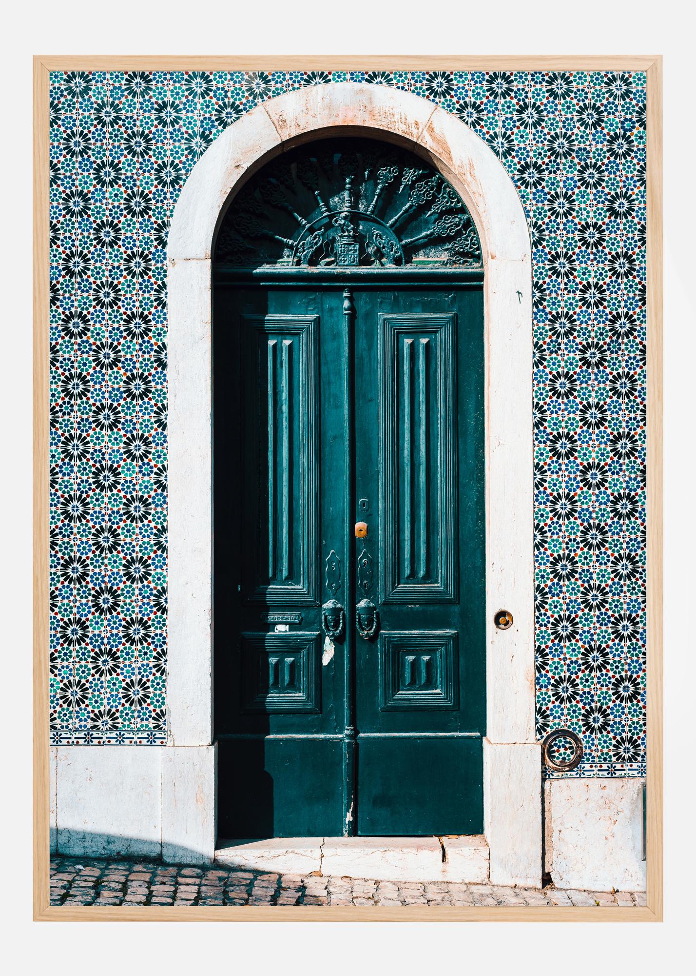 Ovaj elegantni poster prikazuje impozantna zelena vrata, koja su lijepo uokvirena tradicionalnim, detaljnim pločicama u plavoj i bijeloj boji. Klasični dizajn i odvažna boja vrata suprotstavljaju se zamršenim uzorcima, stvarajući osjećaj dobrodošlice i kulturnog bogatstva. Slika prenosi osjećaj pozivnog ulaza u dom ispunjen poviješću i karakterom.