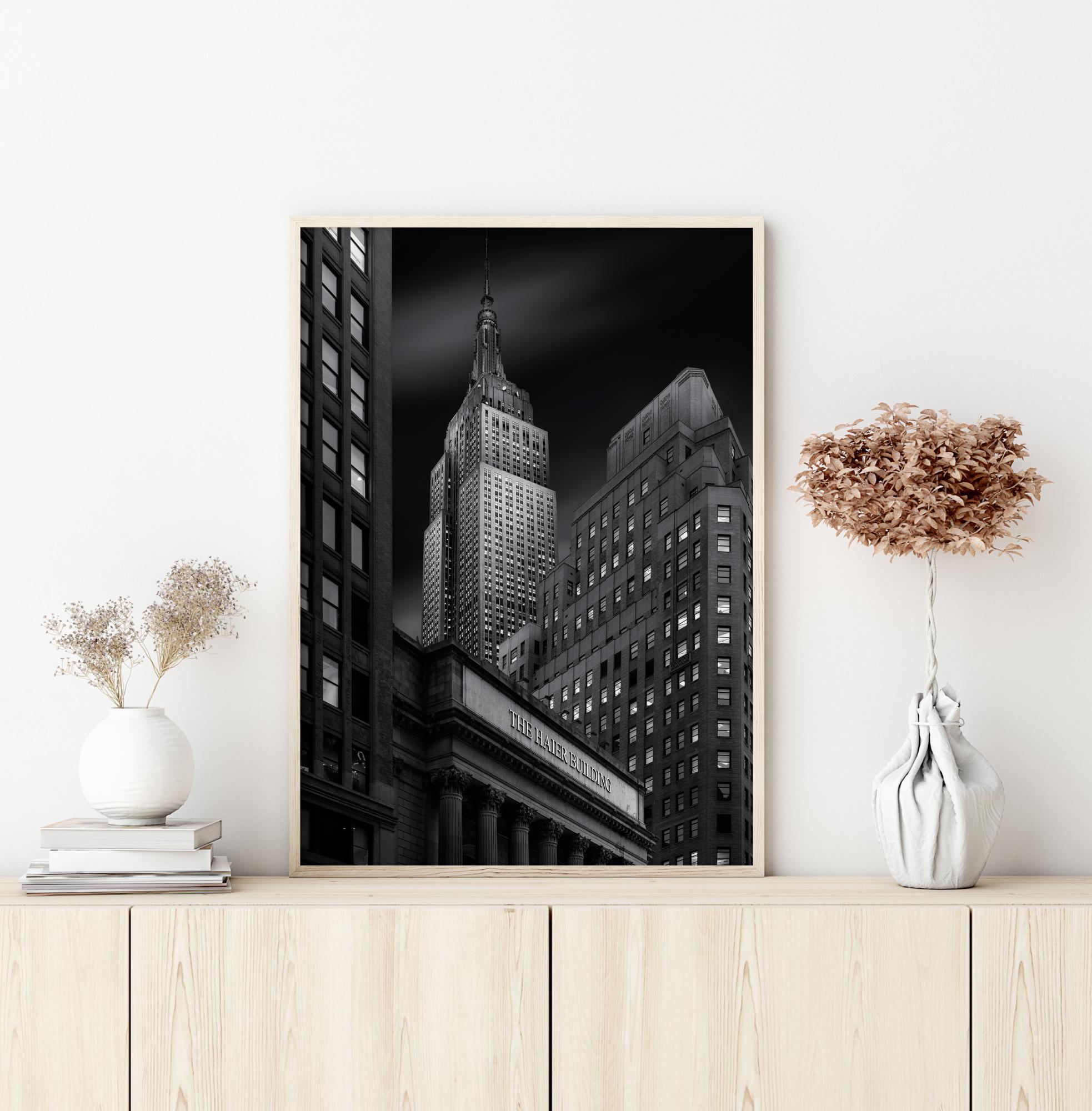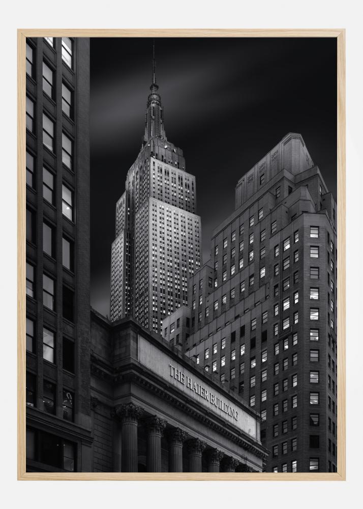 Poster s Haier Building u New Yorku noću. Svijetloplavo zlatna slova zgrade osvjetljavaju i kažu "The Haier Building". S građevinama prema crnom gradskom pogledu, ovo je vrlo istaknuta slika. Ovaj dramatični crno-bijeli poster njujorškog unutrašnjeg grada savršen je na bijelom zidu.