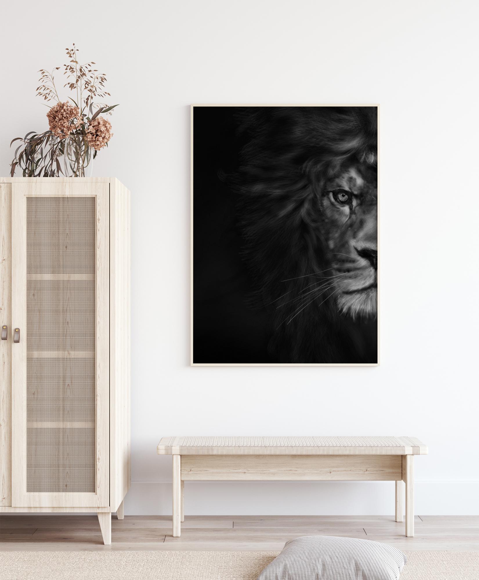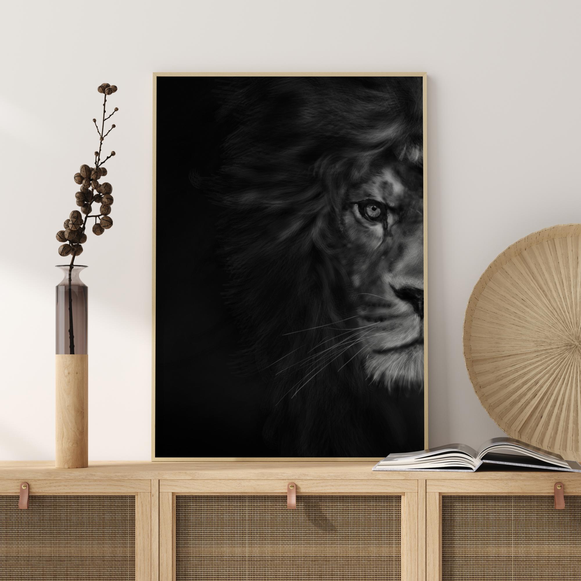 Impresivan crno-bijeli plakat prirode s divljim lavom koji gleda izravno u kameru. Smješteno desno od otiska vidi se samo polovica lavljeg lica. Svojom prekrasnom valovitom grivom i veličanstvenom pozom, sigurno se može definirati kao kralj džungle. Unesite safari-osjećaj u svoj dom.