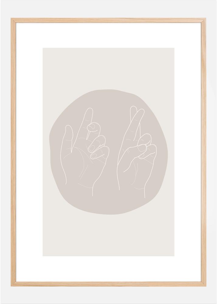 Jednostavan poster s dvije lijeve ruke prema okruglom bež obliku. Krug je postavljen na podlogu boje kože s obje ruke koje pokazuju prema gornjem rubu postera. Ruke su opuštene i stvaraju mirnu atmosferu u vašem domu. Savršena slika za vašu radnu sobu.