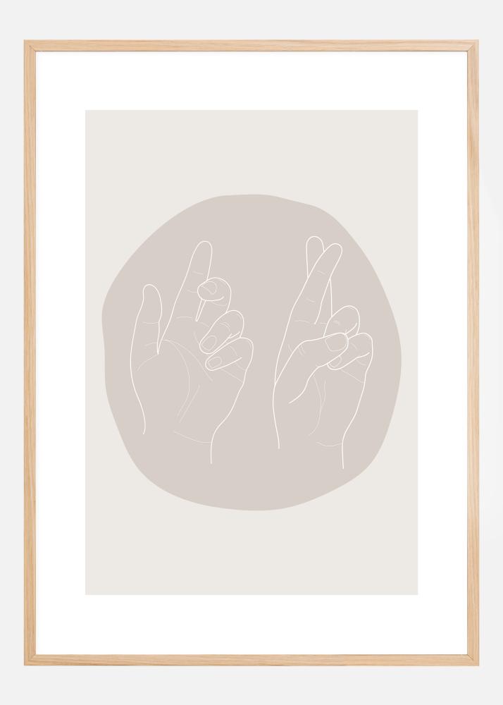 Jednostavan poster s dvije lijeve ruke protiv okruglog bež oblika. Krug je postavljen na pozadinu boje kože s obje ruke usmjerene prema gornjem rubu postera. Ruke su opuštene i stvaraju mirnu atmosferu u vašem domu. Savršena slika za vašu radnu sobu.