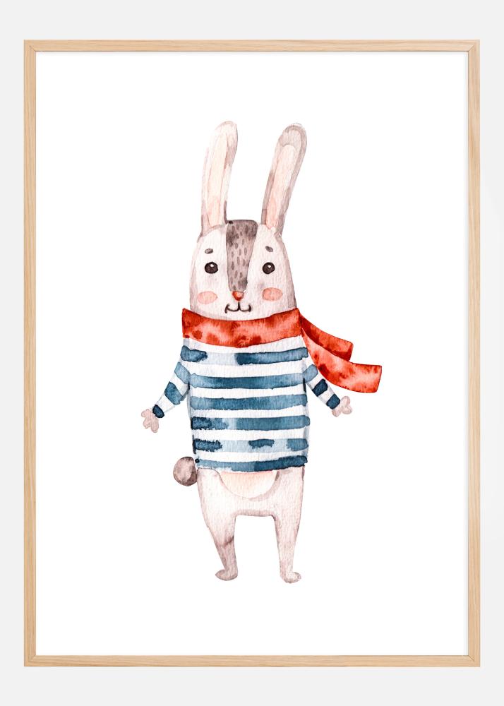 Ovaj šarmantni poster prikazuje veselog zeca odjevenog u prugasti džemper i lepršavi crveni šal. Topli osmijeh zeca i razigrani stav zrače radošću i nevinošću, stvarajući srdačan i privlačan osjećaj. Ilustracija, izvedena u mekim akvarel tonovima, ima lakoću i jednostavnost koja daje dirljiv i nostalgičan efekt.