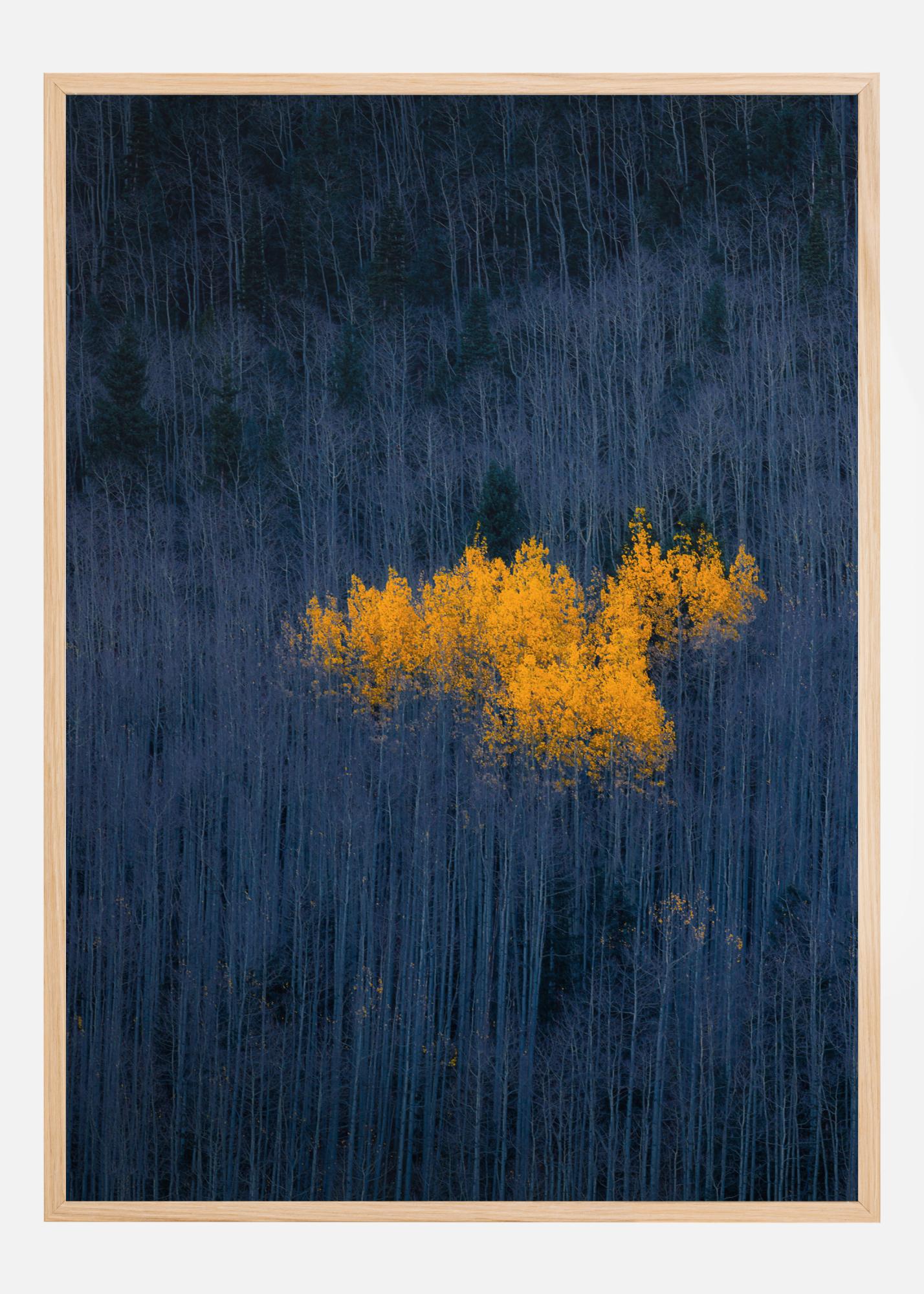 Fantastičan poster koji prikazuje tamnozeleno i ponoćno plavo drveće. U sredini otiska krošnje drveća su istaknute u žutoj boji, što daje otisku malo boje. Prekrasan otisak za objesiti u dnevnoj sobi za stvaranje opuštajuće atmosfere.