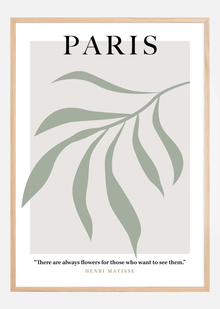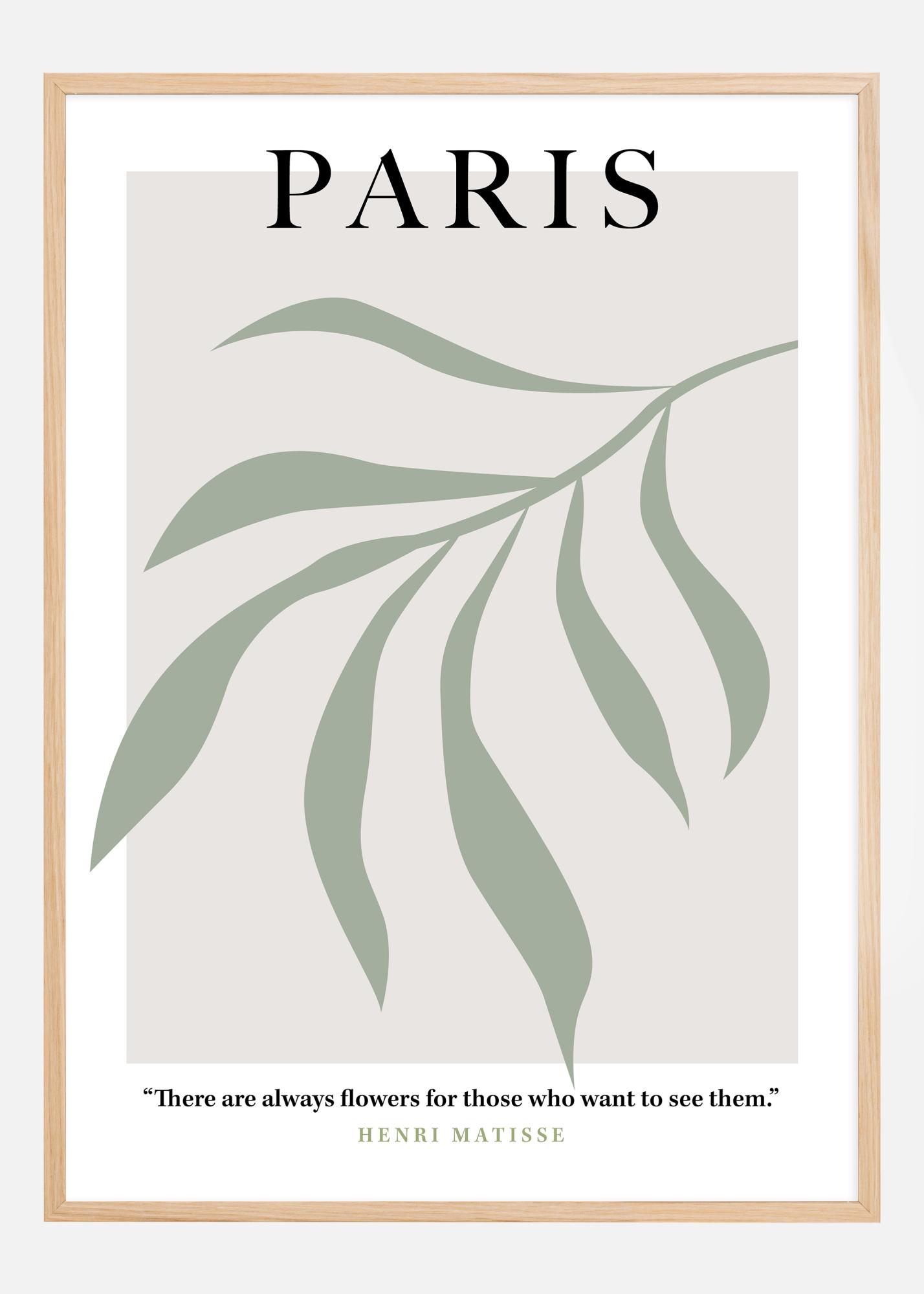 Ovaj stilizirani i elegantni poster nosi riječ "PARIS" velikim slovima, preko pozadine mekanih zelenih linija koje tvore apstraktan, organski oblik, podsjećajući na mirne i svježe vrtove. Njegova prigušena paleta daje osjećaj mira i suptilne elegancije, što odražava reputaciju grada kao središta ljepote i kulture. Nadopunjen je inspirirajućim citatom Henrija Matissea, koji posteru daje dubinu umjetničke mudrosti: "There are always flowers for those who want to see them."