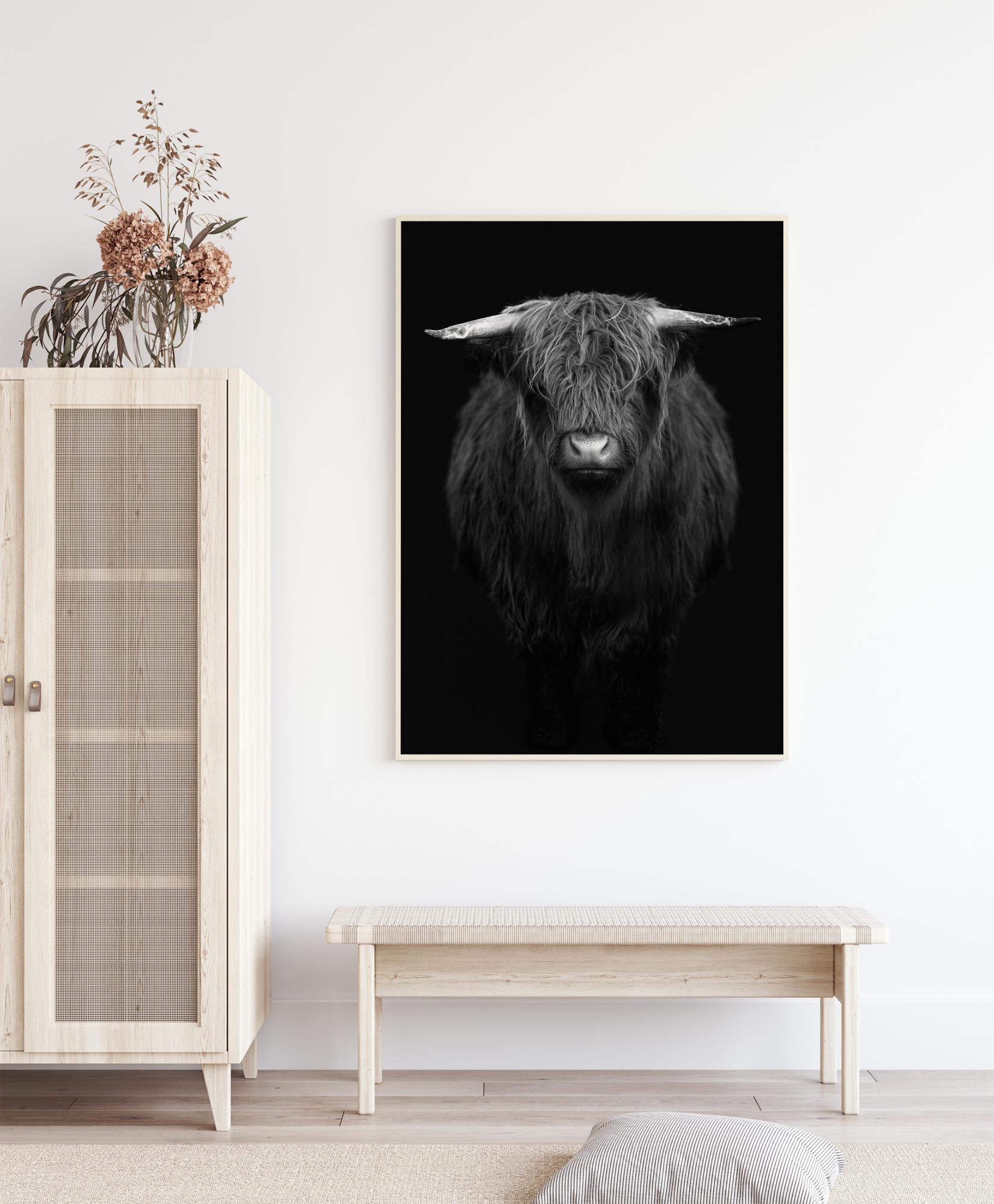 Impresivno crno goransko govedo na crnoj pozadini. Ovo prekrasno stvorenje gleda ravno u kameru i pokazuje svoju dugu crnu valovitu dlaku. Iako je ovaj poster crn na crnom, jasno se ističu bijeli rogovi i njuška goveda. Divite se ljepoti ovog stvorenja dok gleda u kameru.