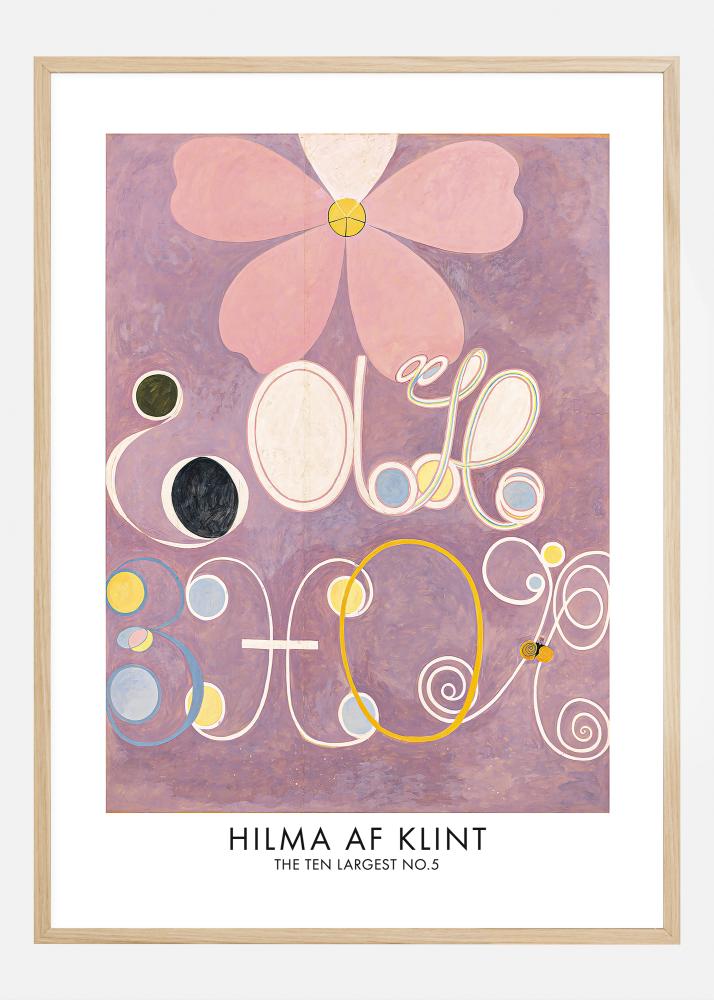 Ovaj poster predstavlja 'The Ten Largest No.5', dio impresivne serije Hilme af Klint koja istražuje različite faze života s apstraktnim i simboličkim oblicima. Mekane pastelne nijanse ružičaste i krem bijele stvaraju središnji cvijet koji postaje srce ovog djela, okružen razigranim spiralama i geometrijskim oblicima u nijansama žute, plave i crne na ljubičastoj pozadini. Ovaj print je odavanje počasti af Klintovom revolucionarnom pristupu i uljepšao bi bilo koju prostoriju svojom mirnom i balansiranom energijom.