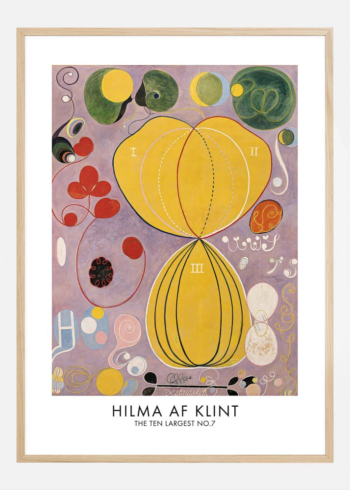 Ovaj poster, koji prikazuje 'The Ten Largest No.7' od Hilma af Klint, prava je gozba za oči, ispunjena razigranim oblicima i smjelim bojama. U središtu djela nalazi se velika žuta figura, podijeljena u tri sekcije, okružena simfonijom krivulja, krugova i spirala u spektru crvene, zelene i plave boje. Apstraktni oblici i okultni elementi na ljubičastoj pozadini čine ovo umjetničko djelo mističnim i meditativnim iskustvom. Ovaj umjetnički print nudi jedinstvenu kombinaciju estetike i filozofije, koja odražava af Klintsovu ambiciju da poveže fizičko sa spiritualnim.