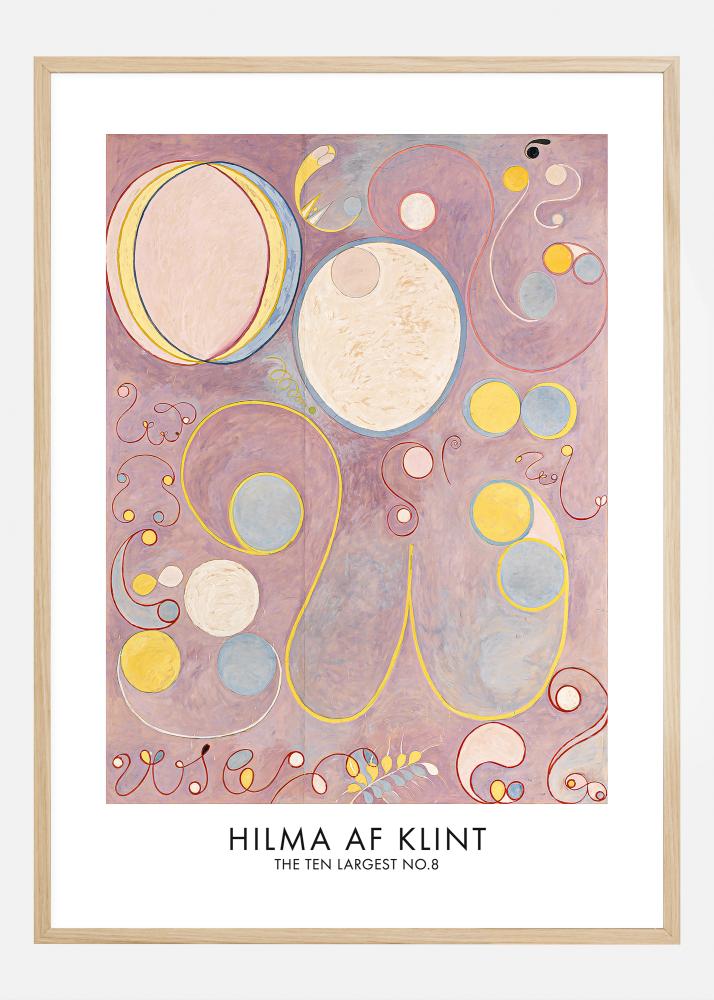 Ovaj poster prikazuje 'The Ten Largest No.8', dio izvanrednog djela Hilme af Klint koje istražuje duhovne dimenzije kroz apstraktnu umjetnost. Ova delikatna kompozicija koristi nježne pastelne boje i fluidne oblike kako bi stvorila osjećaj harmonije i univerzalne ravnoteže. Preklapajuće kružne forme i spirale, istaknute linijama u toploj crvenoj i žutoj na smirujućoj ružičastoj pozadini, zrače obuhvaćajući mir i reflektivnu atmosferu. Ovaj print je fantastična reprezentacija af Klintove odvažne i bezvremenske vizije, i bio bi inspirativan i meditativan dodatak bilo kojem prostoru.